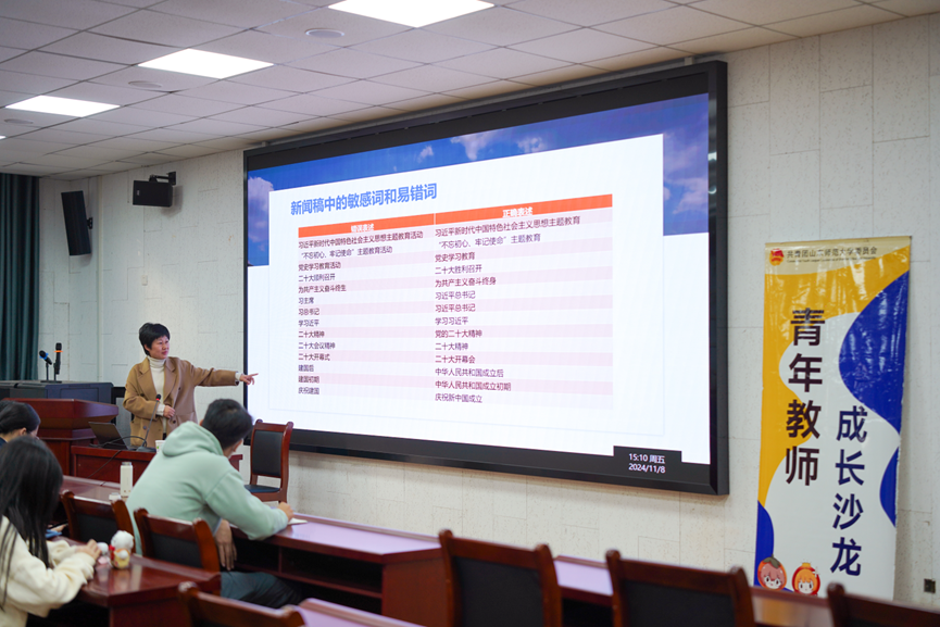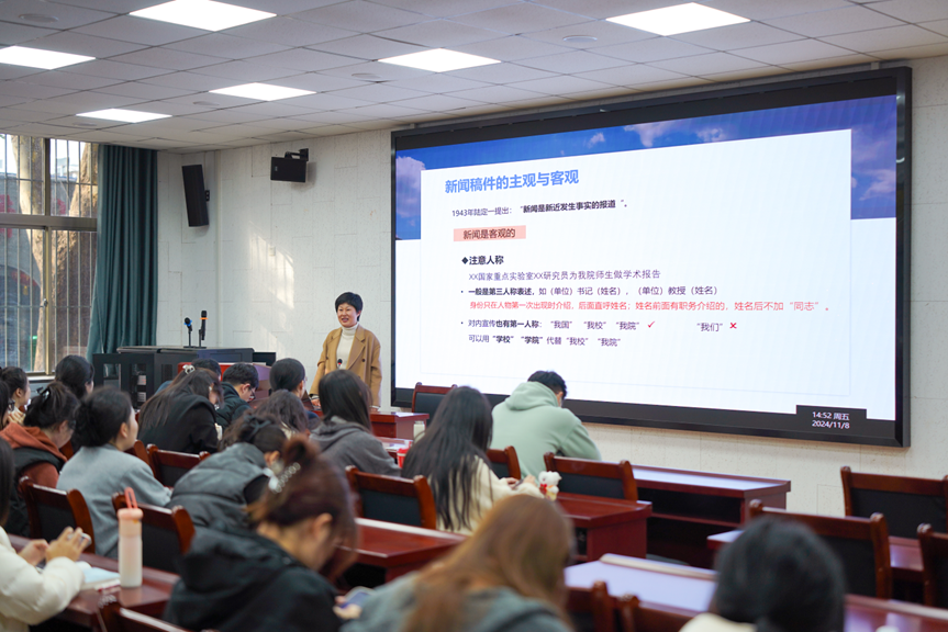 活动伊始,刘阳首先介绍了新闻稿的写作规范,通过讲解经典的新闻稿件,阐明了提升新闻报道质量的重要性。她指出,新闻稿惯用三段式结构,力求简明扼要,突出六要素,确保信息的完整性和逻辑性;要确保报道的客观性,注意人称使用和形容词选择,达到客观的叙述视角;要根据事件的重要性排列内容,使用特定词汇表达重要信息,展现新闻的主观选择性。此外,她还列举了三种新闻稿类型,包括信息、通讯和评论,并举例了新闻稿中的敏感词和易错词。