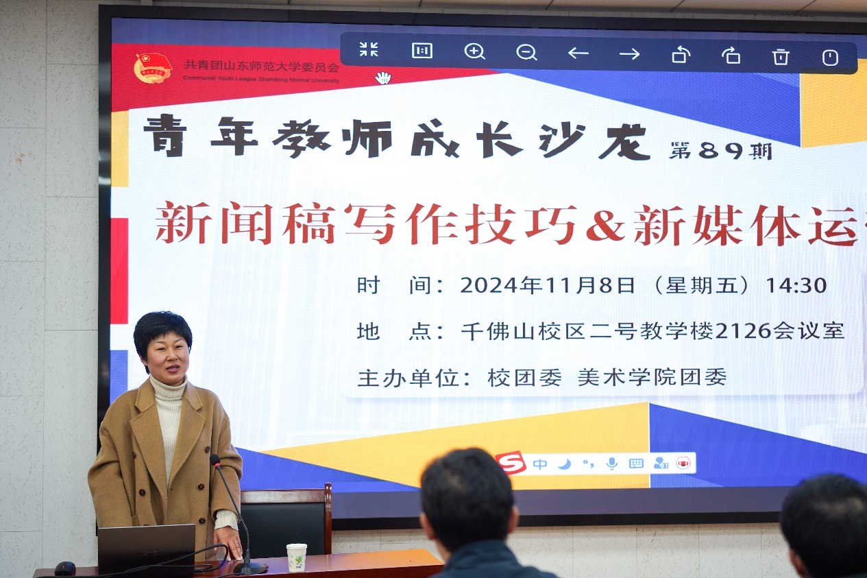 11月8日下午,由校团委、美术学院团委主办的第89期“新闻稿写作技巧&新媒体运营之道”青年教师成长沙龙在千佛山校区教学二号楼2126会议室举行。活动邀请校党委宣传部意识形态工作科科长刘阳老师担任主讲嘉宾。辅导员郑东方、王淑艳、高银东、宋俐志参加活动。院团委书记丁彬主持活动。学院学生会、研究生会及融媒体中心同学参加活动。