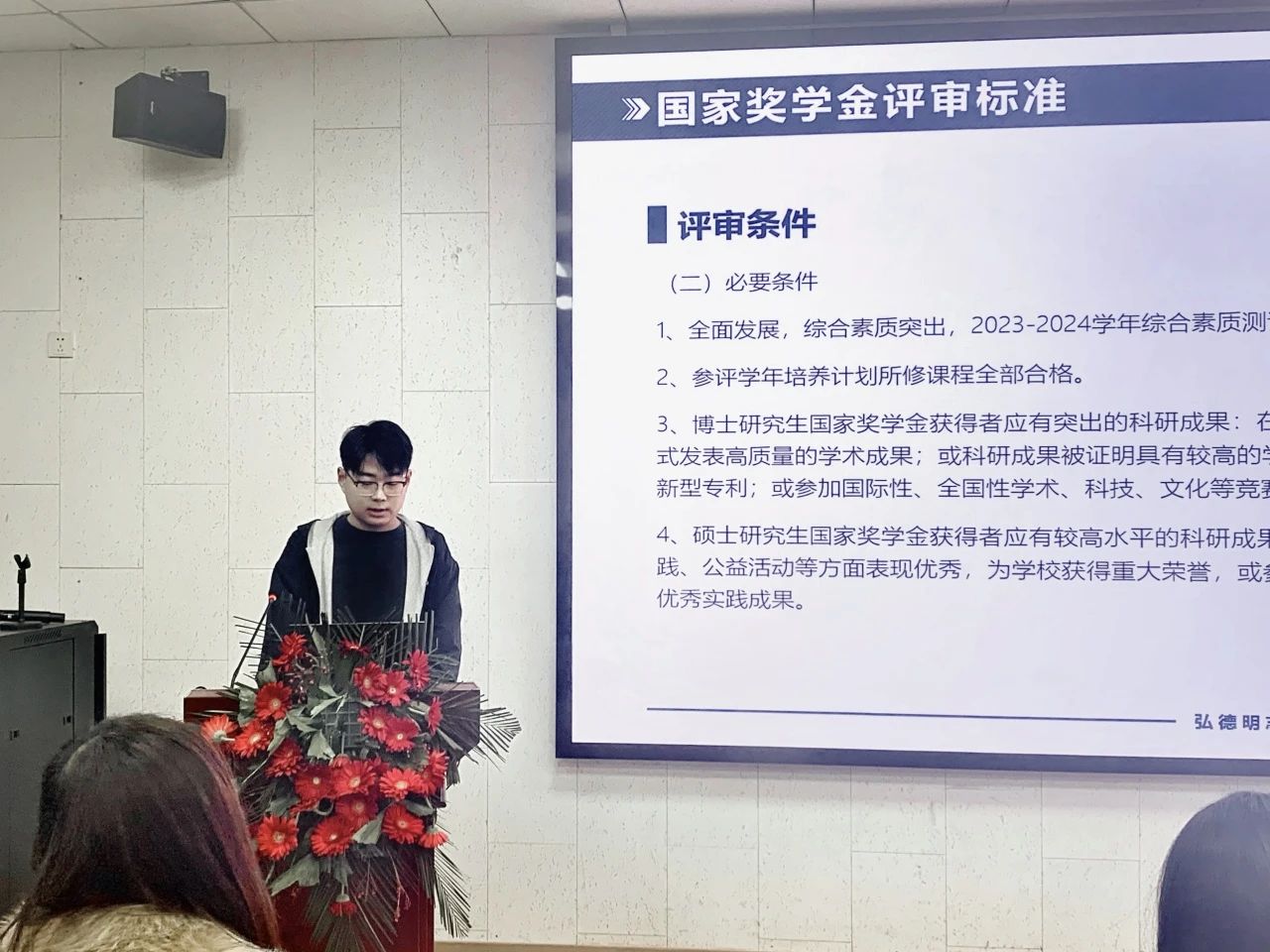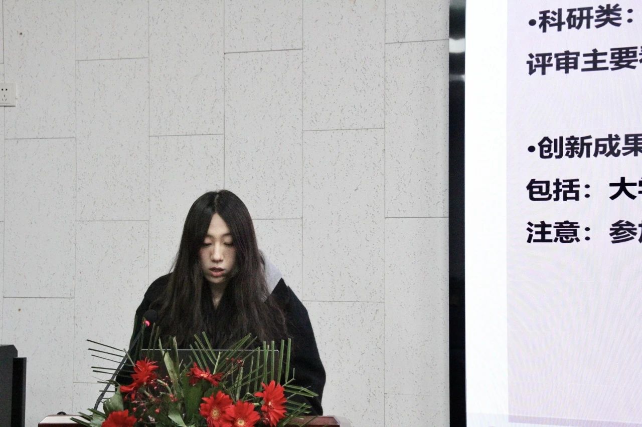 孙亚文解读国家奖学金官方文件内容,介绍了评审条件、名额分配等相关细则,并就申请书撰写规范方面进行分析。她指出,研究生综合素质评价指标体系由德育、智育和体美劳育三个模块组成,并按照2:7:1的比例计算,参与国家奖学金评先的基础条件,是综合素质测评等级为优。最后,孙亚文列举了部分B类赛事名单,鼓励大家参与专业竞赛,并预祝各位都能够取得满意成绩。