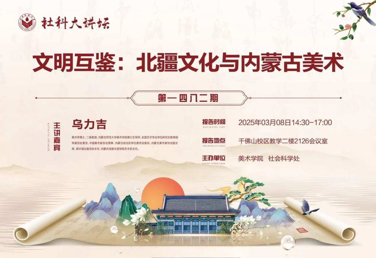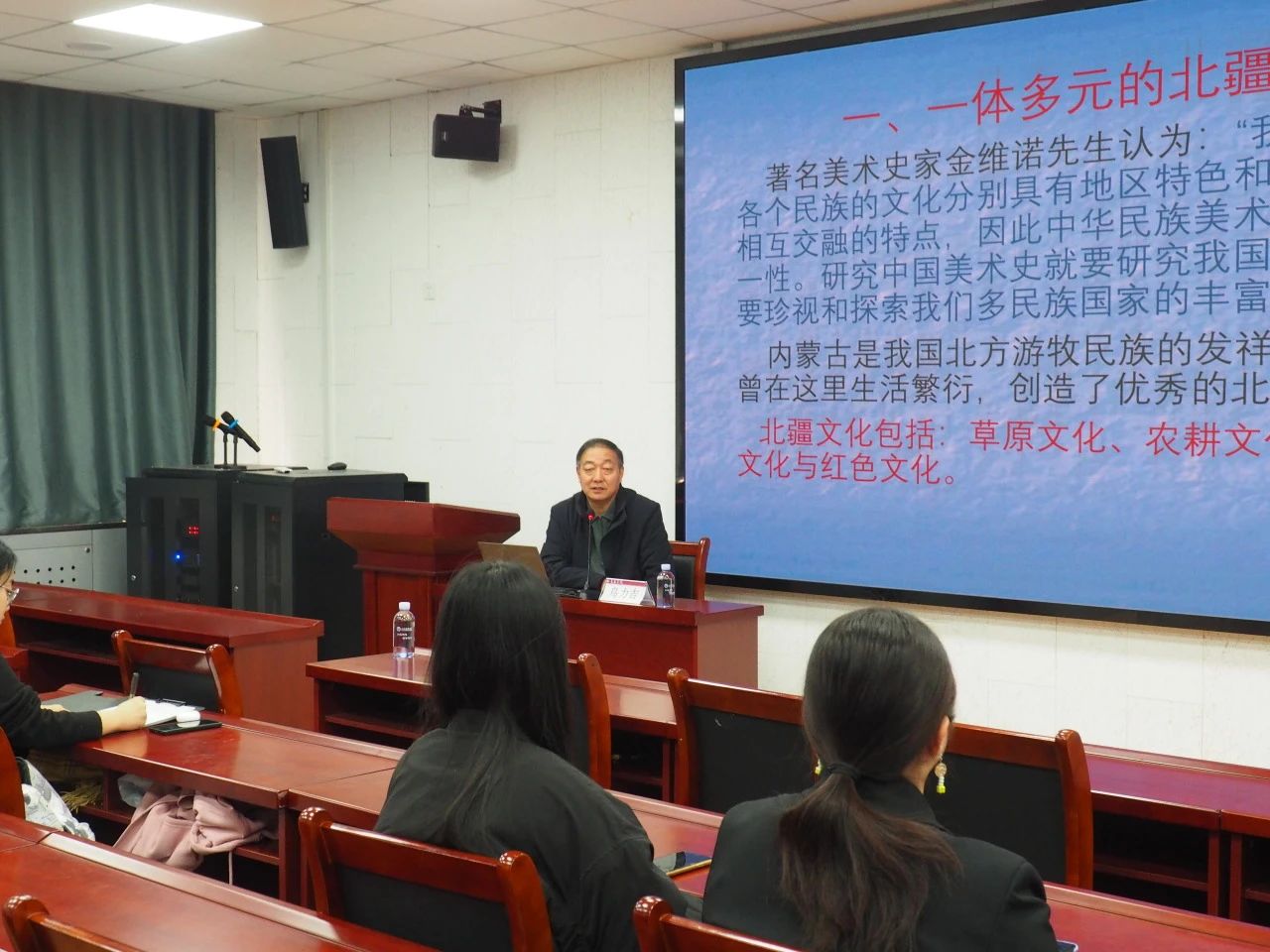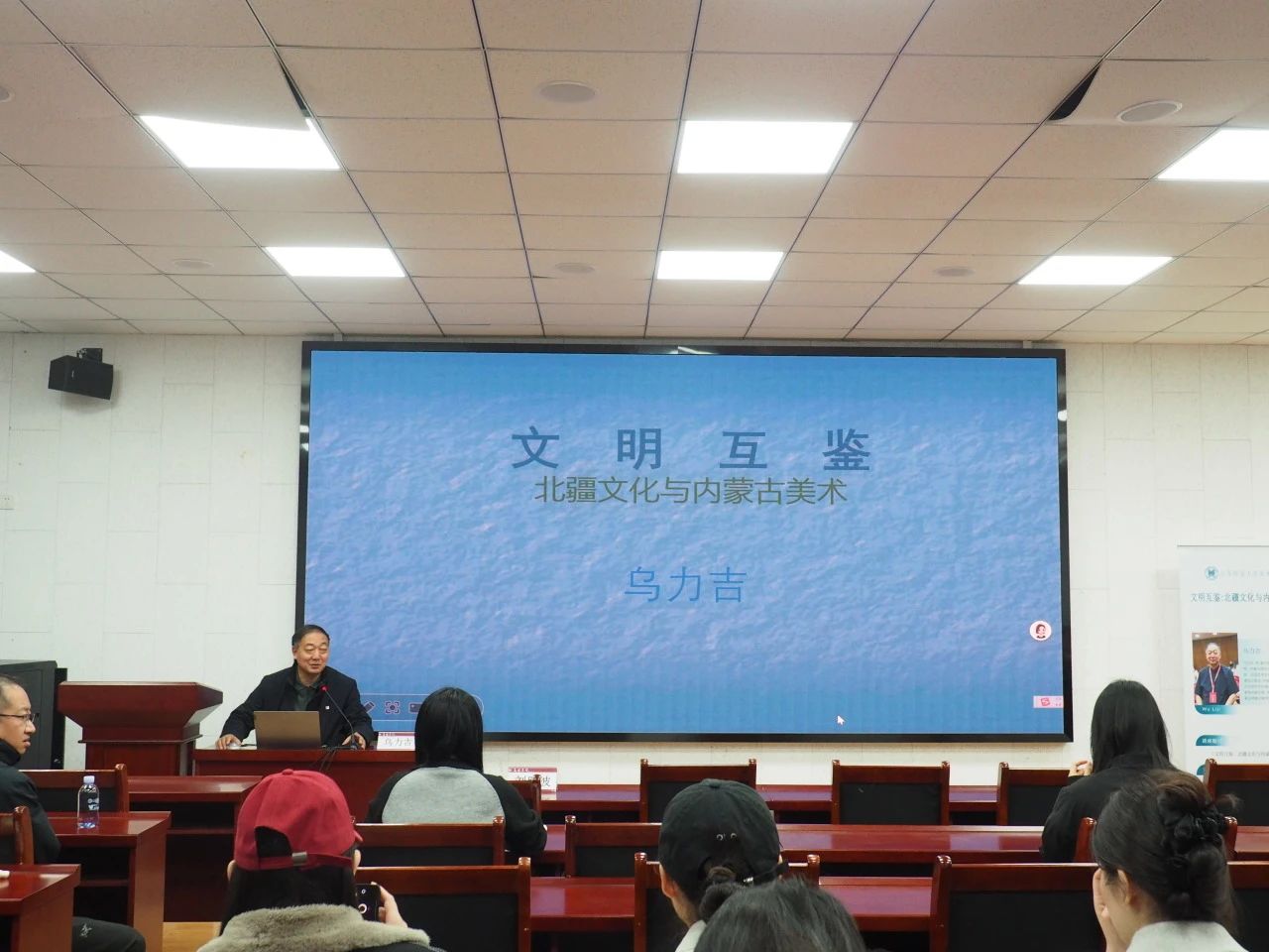 2025年3月8日下午,由山东师范大学美术学院主办的高端学术讲座“文明互鉴:北疆文化与内蒙古美术”在千佛山校区2126会议室隆重举行。内蒙古师范大学美术学院博士生导师乌力吉教授以深厚的学术积淀和生动的案例解析,为现场师生呈现了一场关于北疆文化多维建构与美术创作互动关系的学术盛宴。