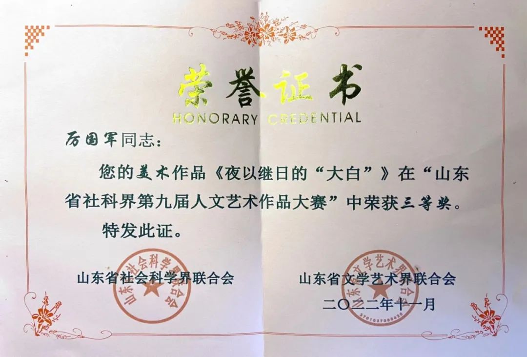 刚刚收到获奖证书,我院教师厉国军创作的《夜以继日的“大白”》油画作品,在“山东省社科界第九届人文艺术作品大赛”中荣获三等奖。