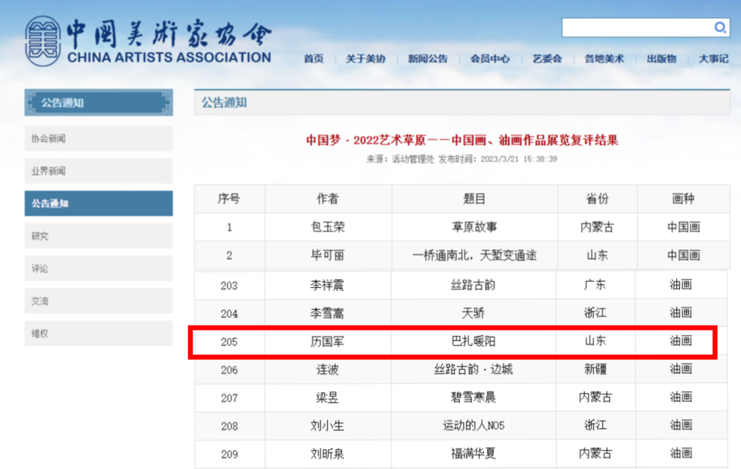 由中国美术家协会、中国文学艺术基金会、内蒙古自治区文化和旅游厅、九三学社内蒙古自治区委员会、内蒙古自治区政协书画院举办的“中国梦·2022艺术草原——中国画、油画作品展览”复评结果于近日公布,我院厉国军老师作品《巴扎暖阳》成功入选。