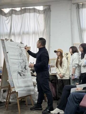 随后,领导与督导们一同移步教学二楼2217画室,观摩由国画系主任孟祥军副教授主讲的《现代水墨画》公开课,学院特意组织了无教学任务的教师及青年教师到场学习。孟祥军进行了一节完整的水墨写生示范教学,从构思起稿、线条描摹到墨色渲染,步步推进,同时结合每个环节细致讲解技术要点与艺术思考。其娴熟的技艺、清晰的讲解和富有启发的教学方式,为观摩师生呈现了一堂高水平的专业示范课。
