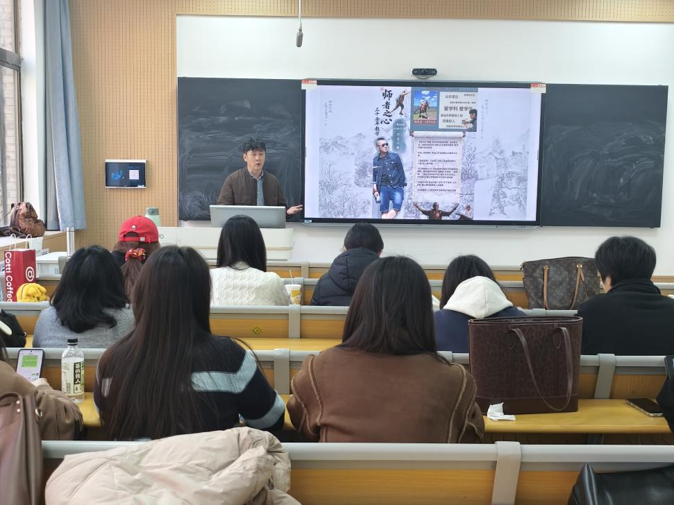 刘文正还针对同学们未来会面临的从“学生”到“教师”的角色转换、教育理论向教学实践转化等重要议题提供了专业指导。在互动交流环节,同学们踊跃提问,现场互动顺畅,气氛活跃。通过分享自身长期坚持写生、勤于观察自然的经历,刘文正特别强调了美术教师保持绘画实践能力的重要性,提醒避免陷入“纸上谈兵”的困境。