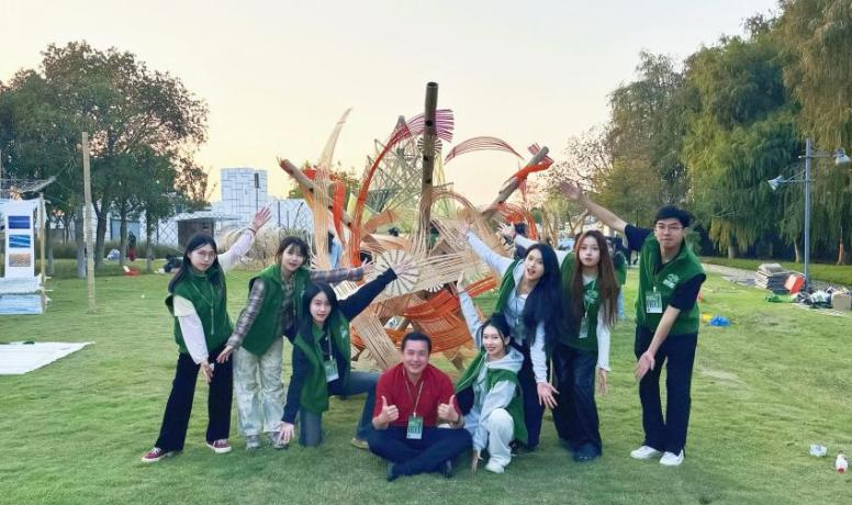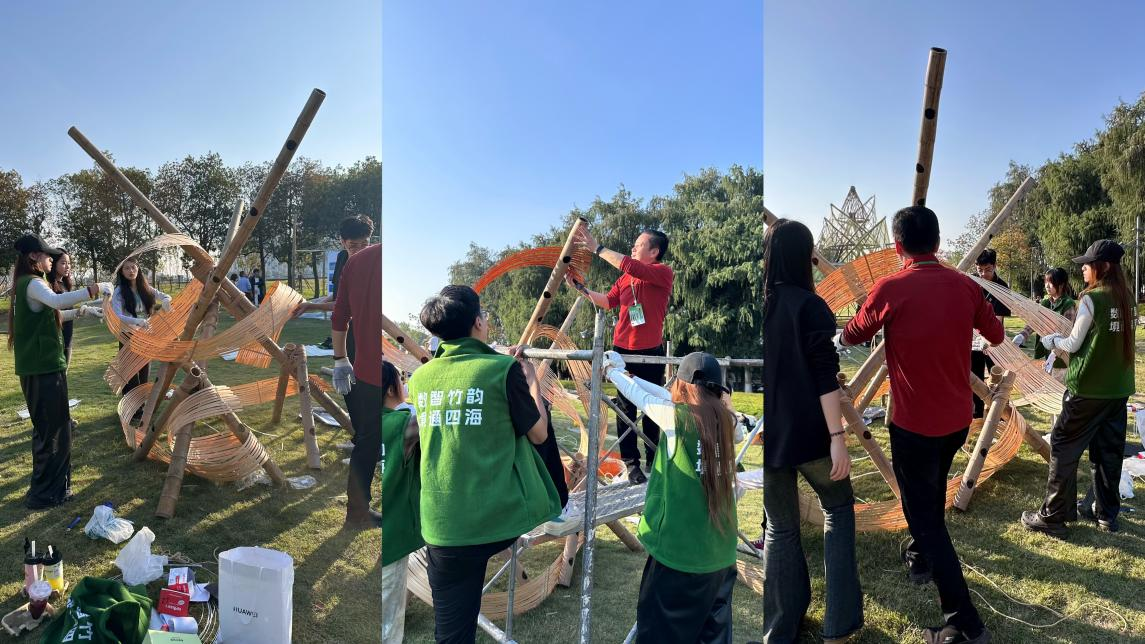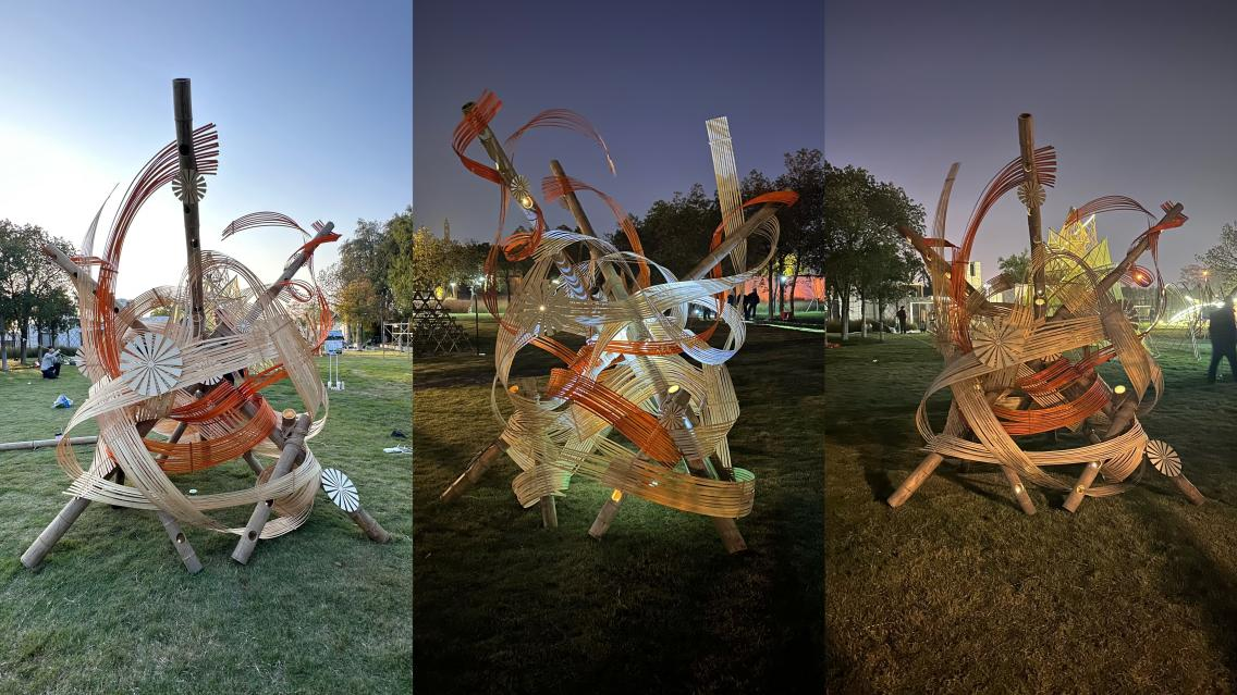 在创作过程中,团队克服了多重技术难题:通过反复实验确定竹材的干燥处理工艺,确保作品在户外环境中的稳定性;借助数字建模技术精准测算竹篾的编织角度,实现“轻盈结构承载多重功能”的设计目标;创新融入智能灯光系统,当市民游客靠近时,装置会通过光影变化与竹材共鸣,呈现“人、竹、境”三者的实时互动,生动诠释了“构筑和谐”的展览主题。作品既保留了竹材温润通透的自然质感,又通过数智技术赋予其现代科技的灵动气息,传统竹编技艺与算法逻辑交织共生,形成了独特的空间叙事语言,成为展览中极具辨识度的亮点作品之一。