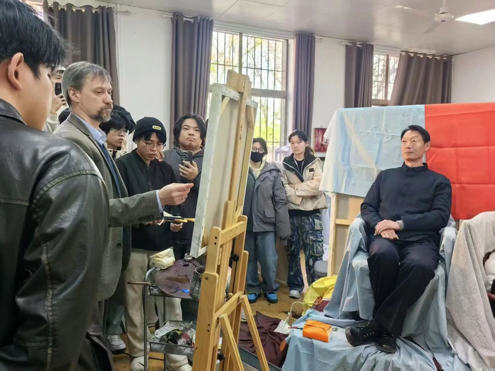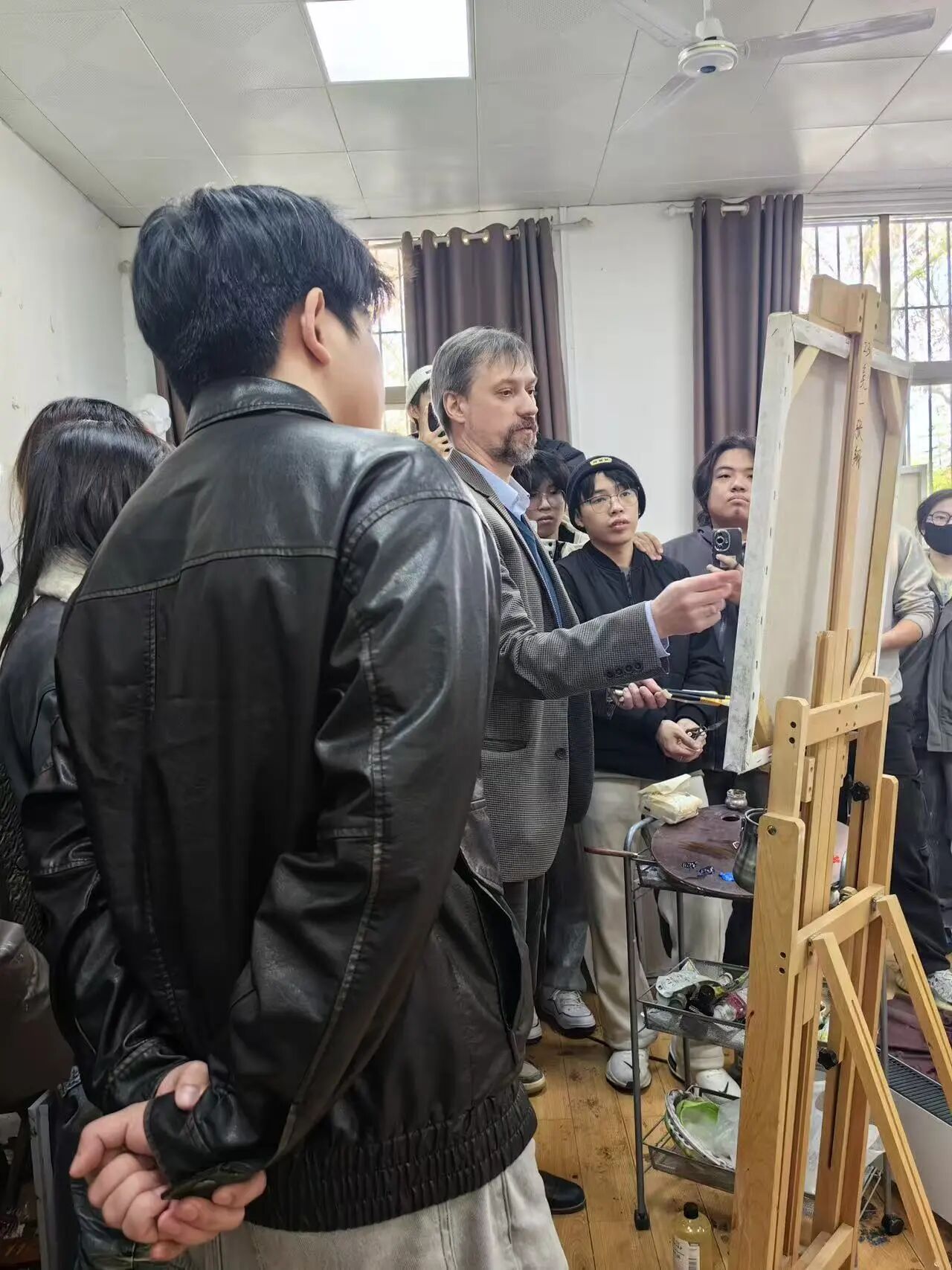 课程尾声,加里宁教授对同学们的习作进行逐一点评,既精准指出作品的优化方向,也充分肯定同学们的创作潜力与独特思路,让在场的每位同学都明确了自己的提升路径。点评结束后,他还现场示范油画写生,让同学们近距离学习专业技法,其专业细致的教学态度赢得师生一致好评。