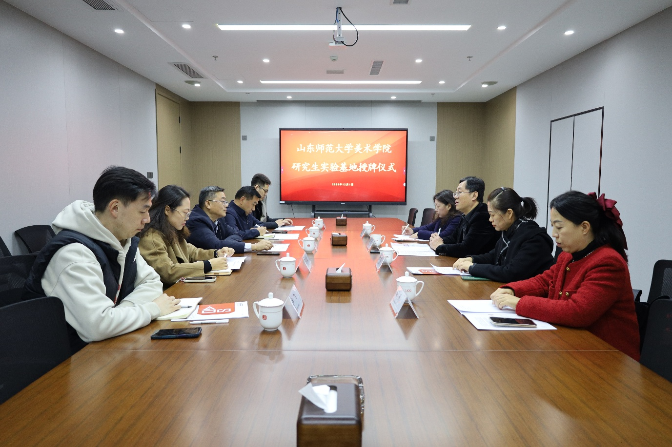 为深化产教融合,提升研究生实践能力,12月1日上午,美术学院在山东建筑大学设计集团有限公司举行研究生实践基地授牌仪式。集团公司党委书记梁洪峰、副总经理张宣峰、风景园林设计一院院长李文君、行政管理部主任蒋超、技术与质量管理部主任卢飞,我院党委书记崔勇、副院长李民、设计专业学位点负责人周臻、设计系副主任葛丹出席活动。