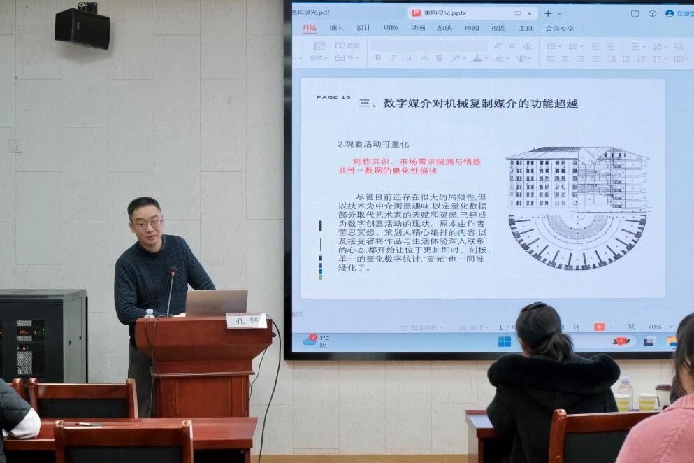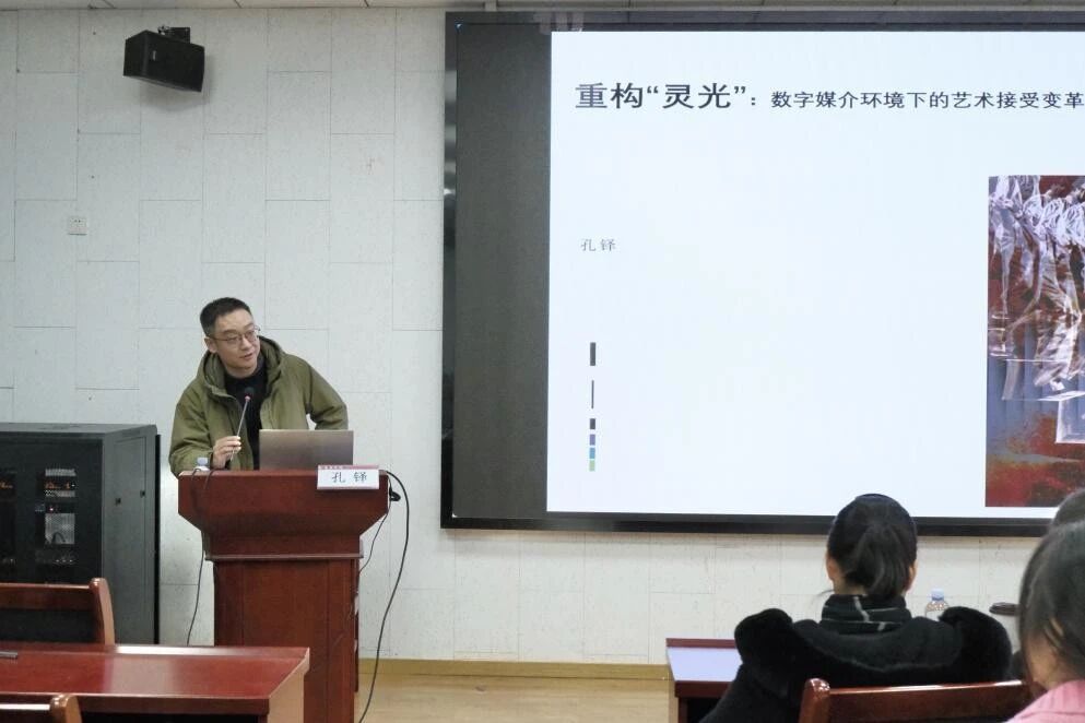 12月12日,美术学院在千佛山校区教学二楼2126室举办“重构灵光:数字媒介环境下的艺术接受变革”学术讲座。山东财经大学文学与新闻传播学院教师孔铎担任主讲人,讲座由美术学院副院长李民主持,美术学院部分教师及研究生到场聆听。