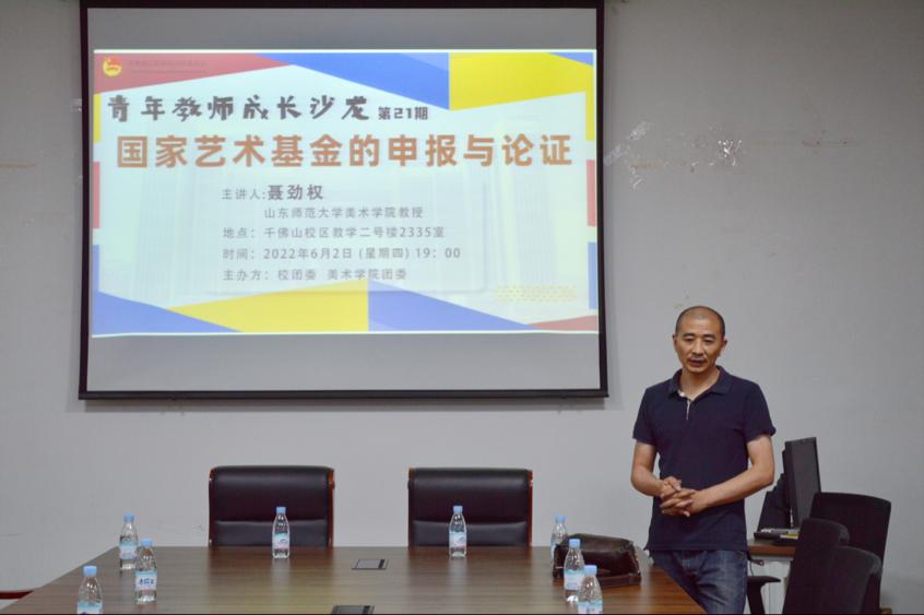 6月2日晚,青年教师成长沙龙之“国家艺术基金的申报与论证”交流会在千佛山校区教学二号楼2335会议室进行。山东师范大学美术学院教授聂劲权担任主讲嘉宾,孙夕恺副院长主持,美术学院青年教师参会。