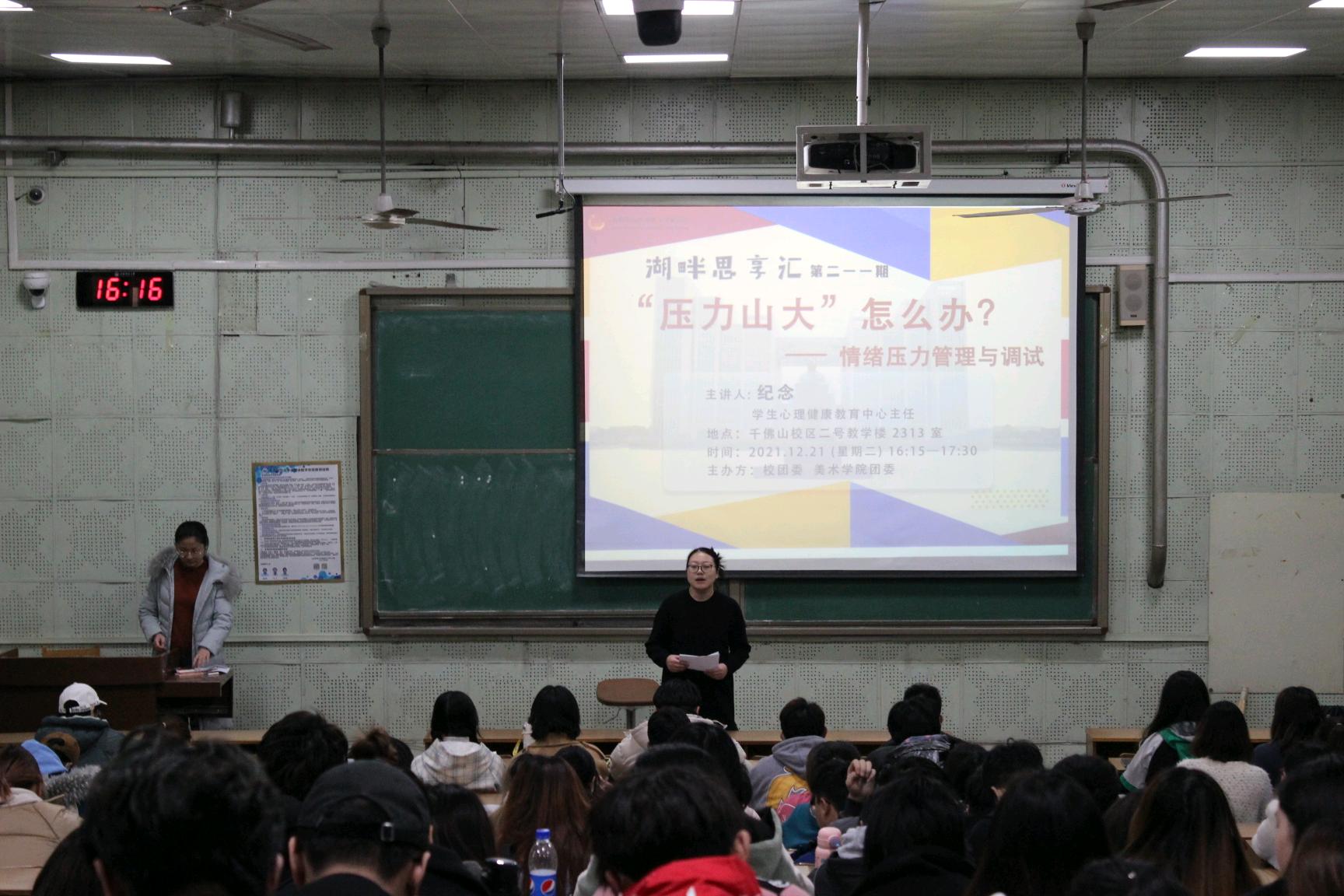 12月21日下午,美术学院于千佛山校区教学二楼2313举办湖畔思享汇之“‘压力山大’怎么办?--情绪压力管理与调试”讲座,学生心理健康教育中心主任纪念担任此次主讲人,美术学院学生到场聆听。
