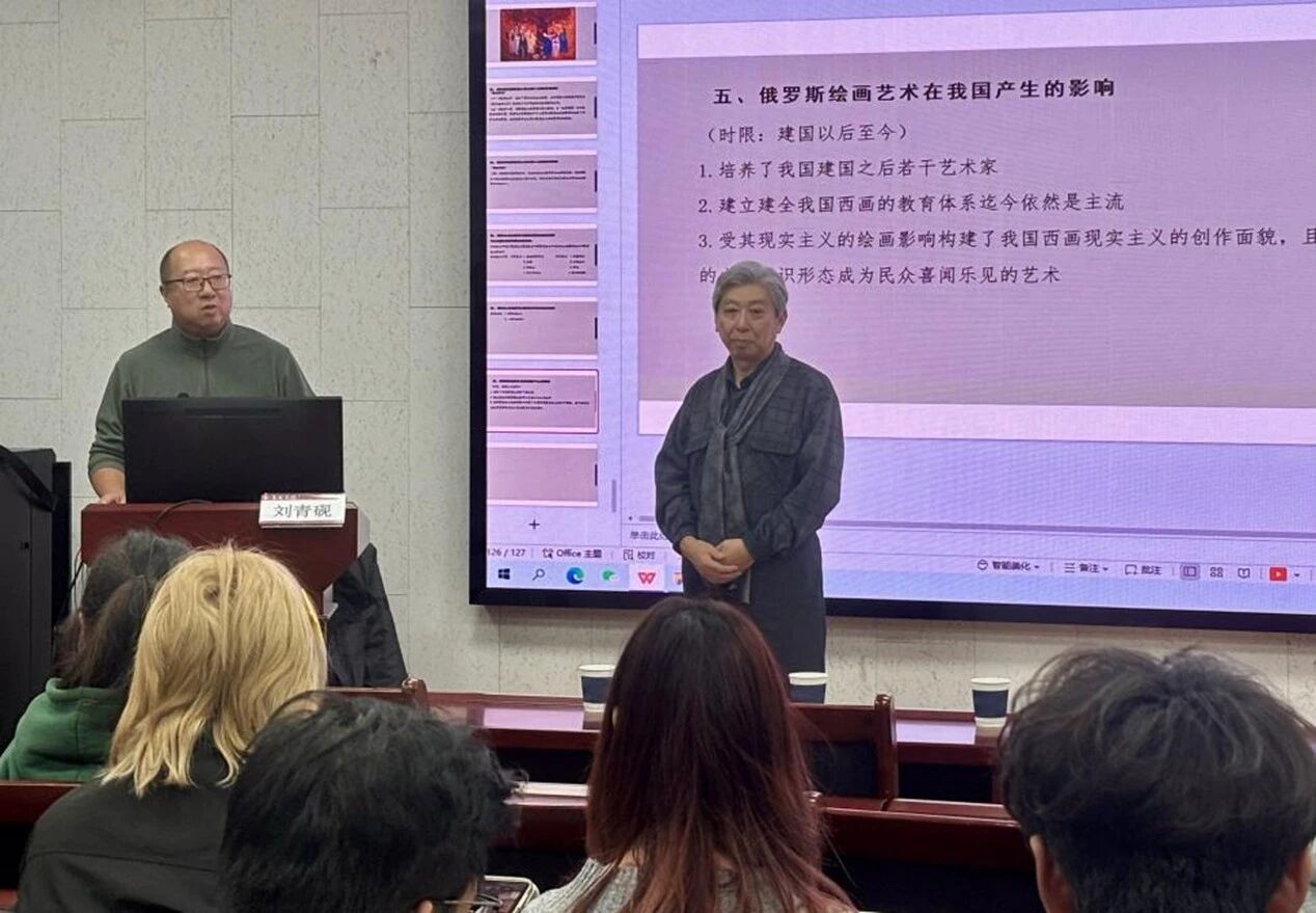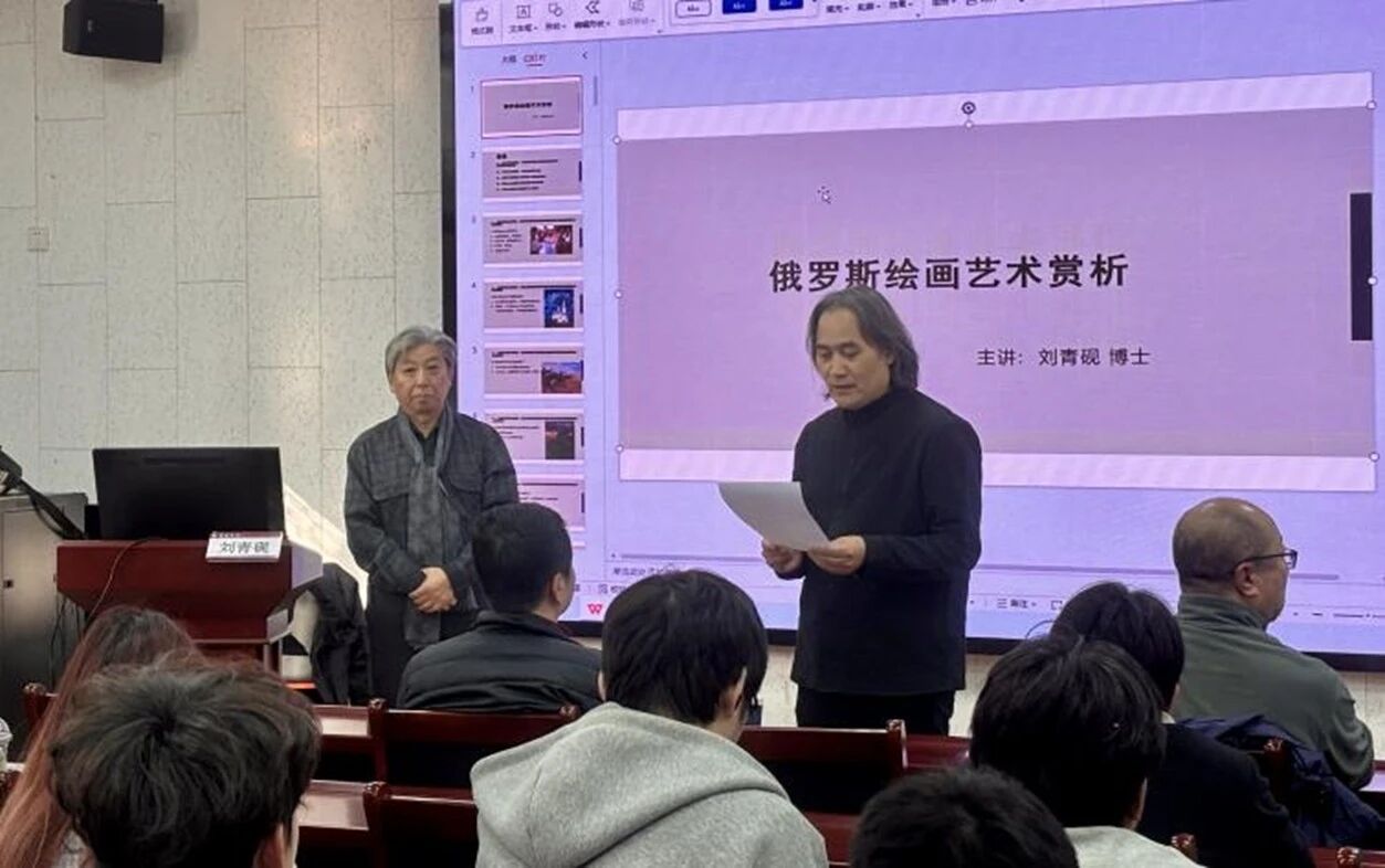 讲座开始,孙夕恺介绍了刘青砚在油画创作实践与俄罗斯艺术研究方面的深厚造诣,强调本次分享对师生艺术成长的重要意义。刘青砚围绕俄罗斯油画艺术的发展脉络与核心成就展开论述,从三个维度阐释了研究俄罗斯油画的价值:其一,上世纪末以来,俄罗斯油画在西方艺术格局中重新回暖,批判现实主义、新艺术运动、抽象艺术三大板块的成果引发国际关注,卢浮宫、中国国家博物馆等先后举办相关大展;其二,我国现代油画教育体系源于前苏联,契斯恰科夫教学体系至今仍深刻影响着美术人才培养;其三,对俄罗斯油画的研究,可为中国油画民族化探索提供重要借鉴。
