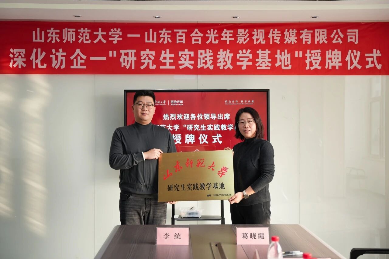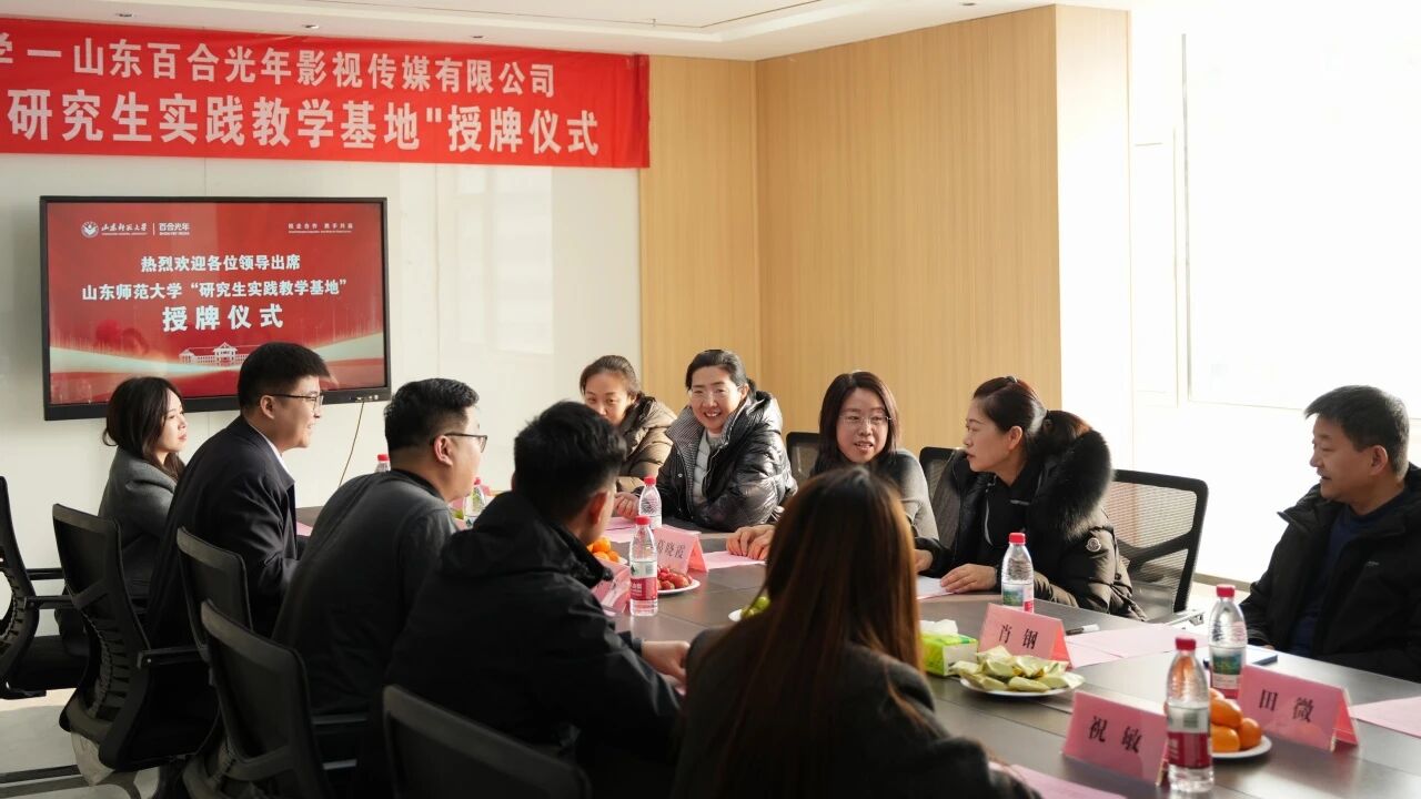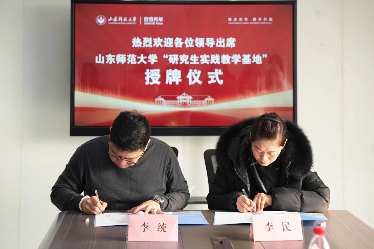 双方顺利完成签约与授牌,山东师范大学研究生实践教学基地在山东百合光年影视传媒有限公司正式设立,为产学研协同育人搭建起了坚实平台。