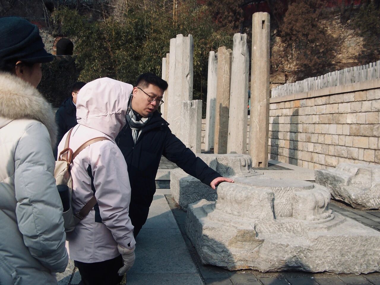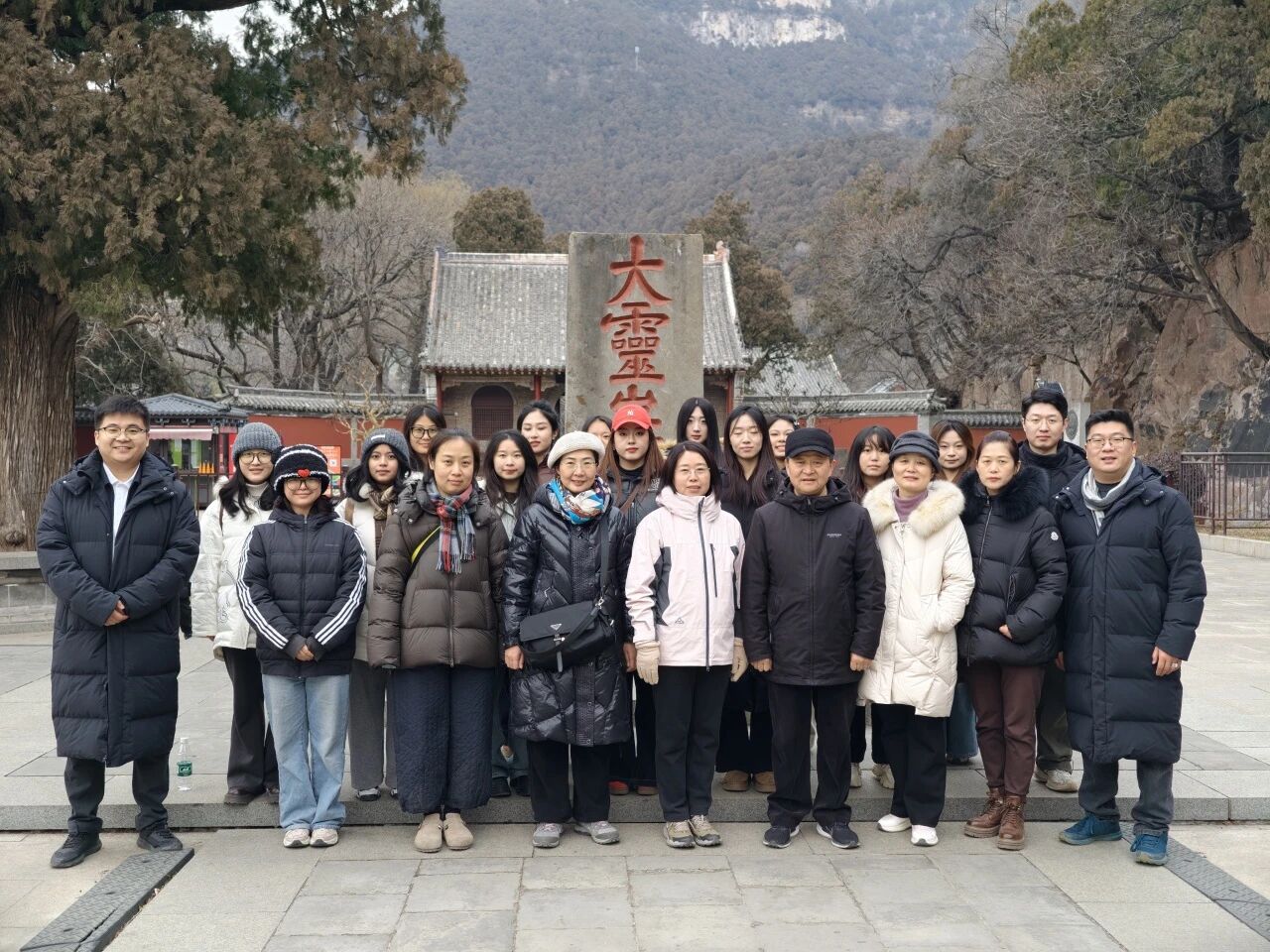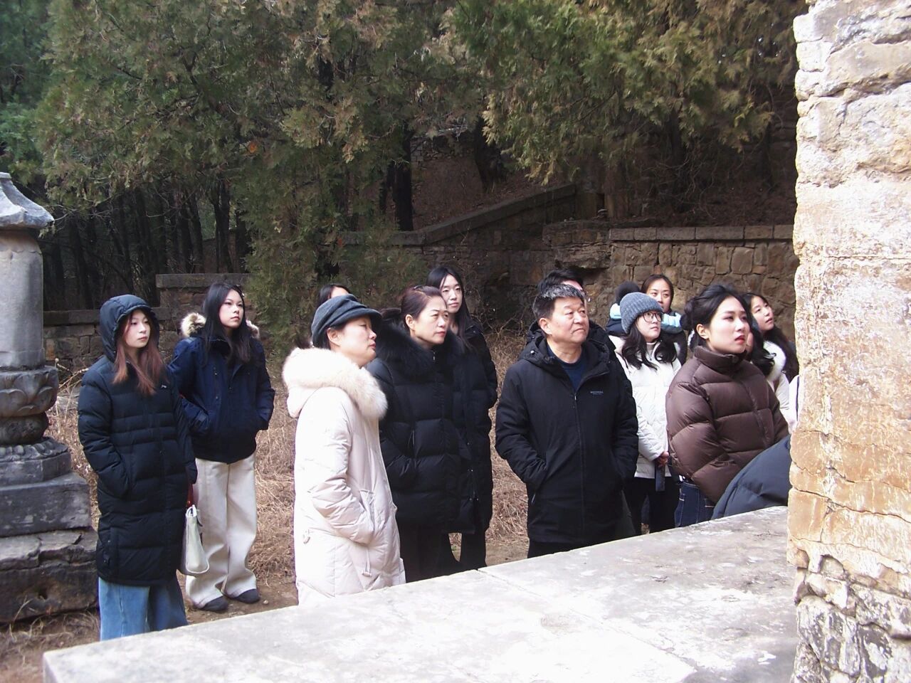 随后,美术学院师生一行在李统的带领下前往灵岩寺开展研学实践。李统从“灵岩胜境”石坊的纹样装饰,到崇兴桥基座跨越唐宋元明清的“层叠历史”,从千佛殿藤胎泥塑的生动造像,到石制墓塔林的匠心营造,以专业视角解读了古寺建筑的美学精髓与文化内涵。千佛殿内,四十尊彩色泥塑罗汉像神态各异,其造型技法与色彩运用为美院学子提供了鲜活的传统艺术范本;墓塔林中,石制墓塔造型各异、结构精巧,塔座、塔身、塔刹的雕刻内容丰富、技法多样、蕴涵深邃,展现出古代匠人高超的营造智慧。师生漫步古寺,沉浸于艺术美学与宗教文化的相互交融之中,在斑驳碑刻与精美造像间,触摸到了传统美术的传承脉络。