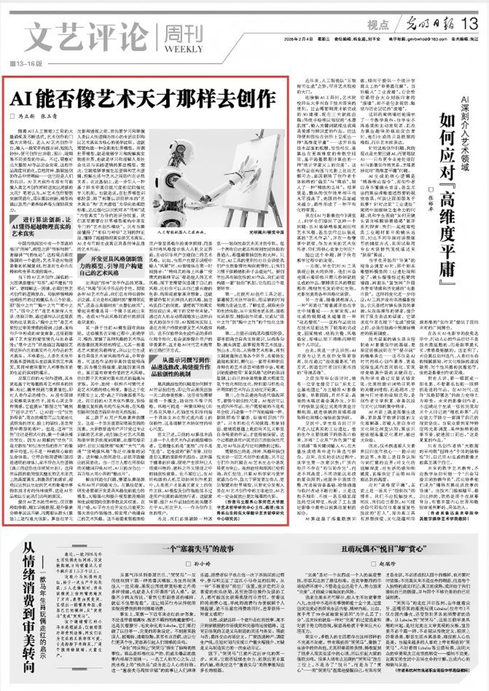 近日,山东师范大学数字艺术哲学研究中心主任马立新和山东师范大学数字艺术哲学研究中心研究员张玉青在《光明日报》“文艺评论”周刊发表题为《AI能否像艺术天才那样去创作》的文章。文章聚焦人工智能介入艺术领域的前沿议题,深入剖析了AI艺术创作的本质特征、核心局限与发展路径。