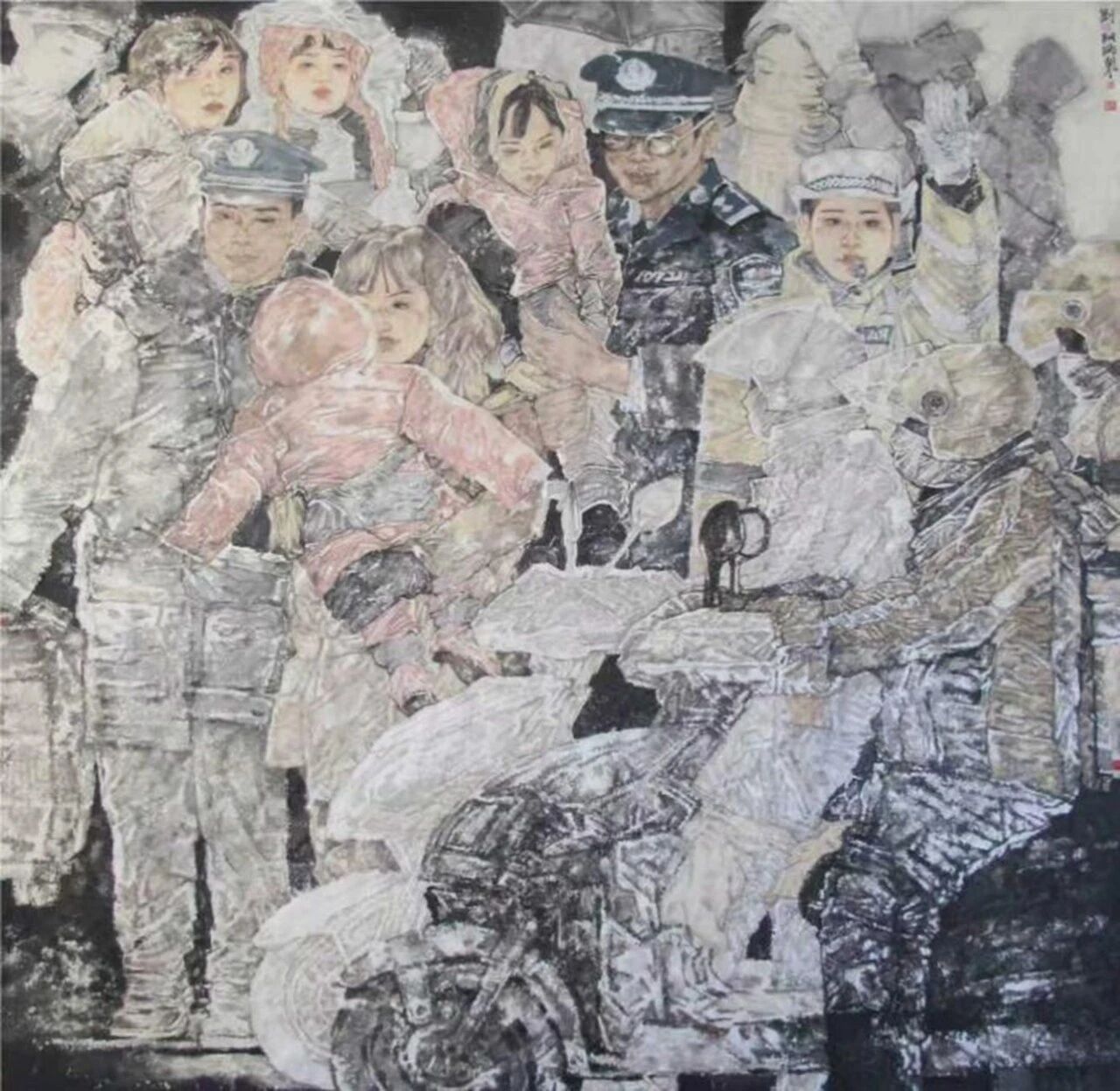 画面以浓淡干湿的笔墨塑造人物,以厚重皴擦表现冰雪质感,以冷暖色调对比凸显警民温情。民警怀抱孩童、疏导交通的身影,与群众焦急的神态形成呼应,生动诠释人民警察 “人民至上、生命至上” 的初心使命。作品融合传统笔墨精神与时代精神,以写意造型传递写实情感,既展现风雪的严酷,更彰显警魂的滚烫,致敬每一位在危难时刻挺身而出的人民卫士,礼赞警民同心、共克时艰的时代力量。