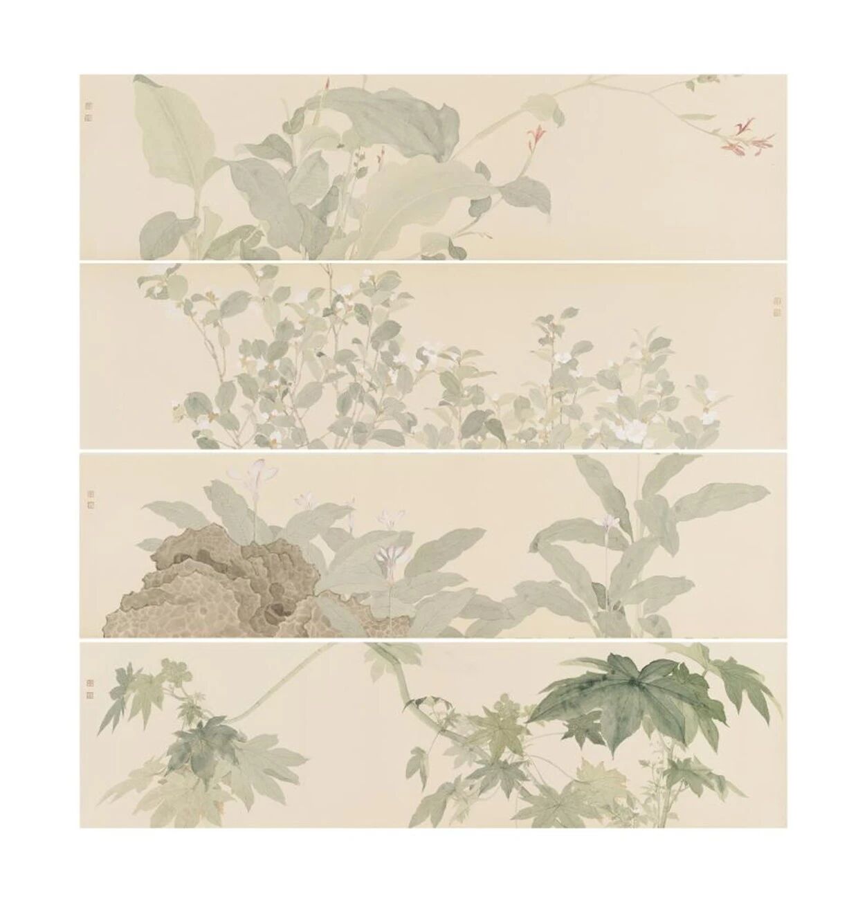 《秋色叠翠》以工笔花鸟画为表现形式,通过四幅横向构图的长卷式画面,细腻描绘不同品类的草木花卉与山石景致。画作延续了中国传统没骨画的清新雅致风格,在色彩运用上以柔和的米色调为底,以淡绿、浅粉、素白等色调铺陈植物形态,叶片脉络、花瓣层次皆细致入微,既保留了自然物象的生机与质感,又通过虚实相生的构图营造出秋日园林“叠翠含韵”的静谧意境——或枝叶舒展、或繁花点缀、或石畔生姿,整体画面气韵连贯,尽显秋日草木的温润与生机。