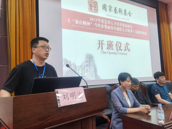 本项目负责人、山东师范大学美术学院院长刘明波就《泰山精神---当代水墨画青年创作人才培养》项目申报初衷、专家团队、培训安排、成果展现、保障措施等方面介绍了项目组织实施情况。