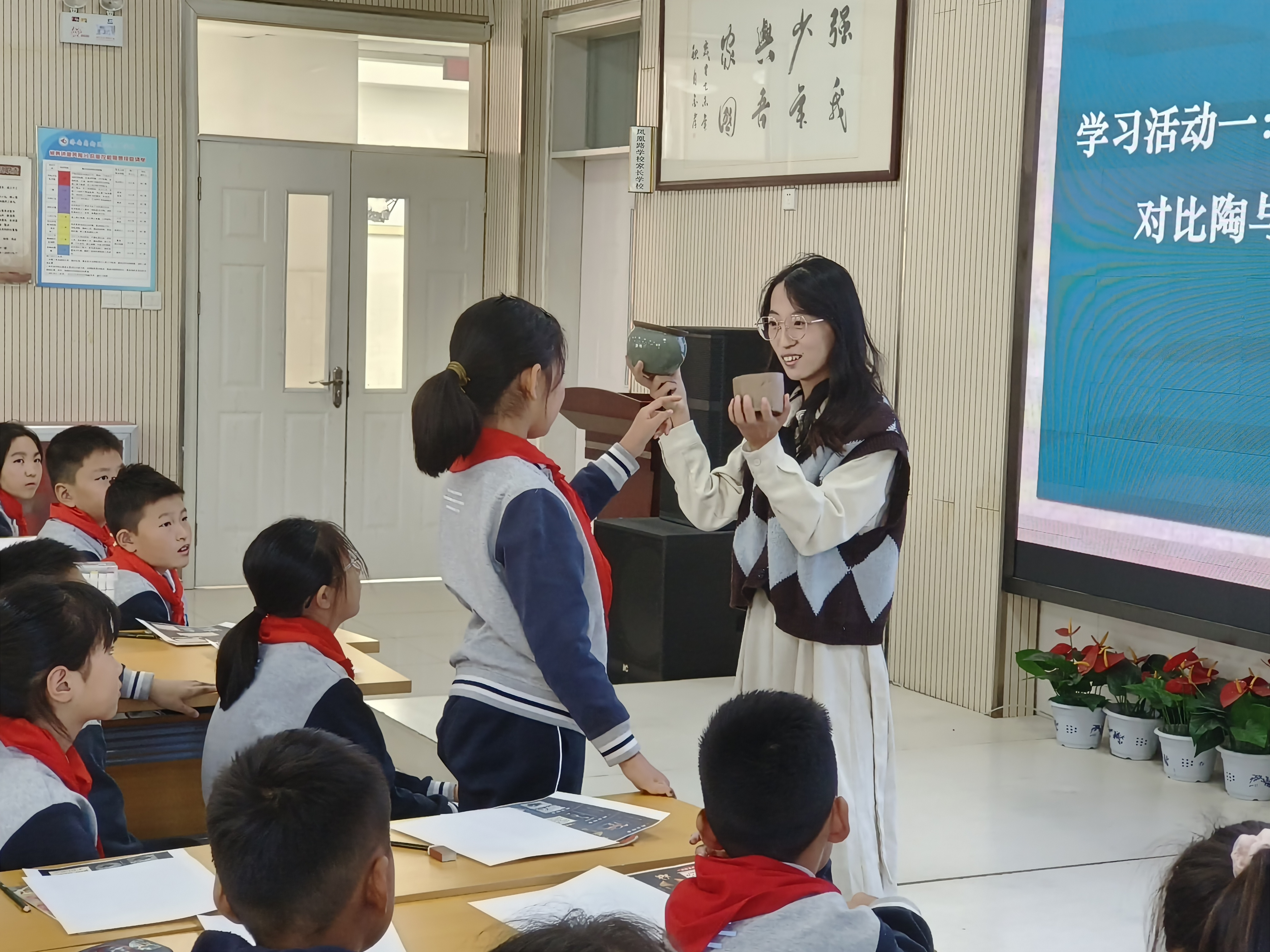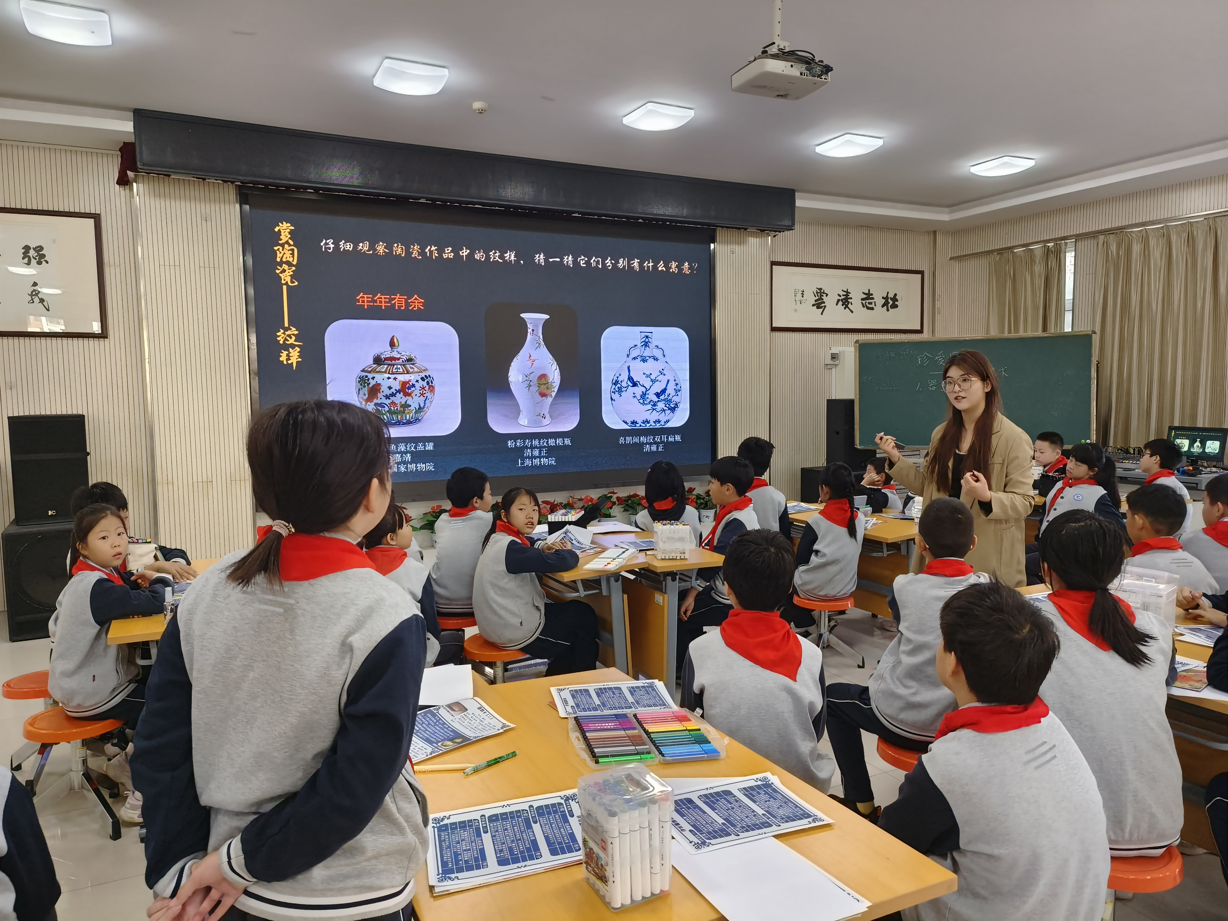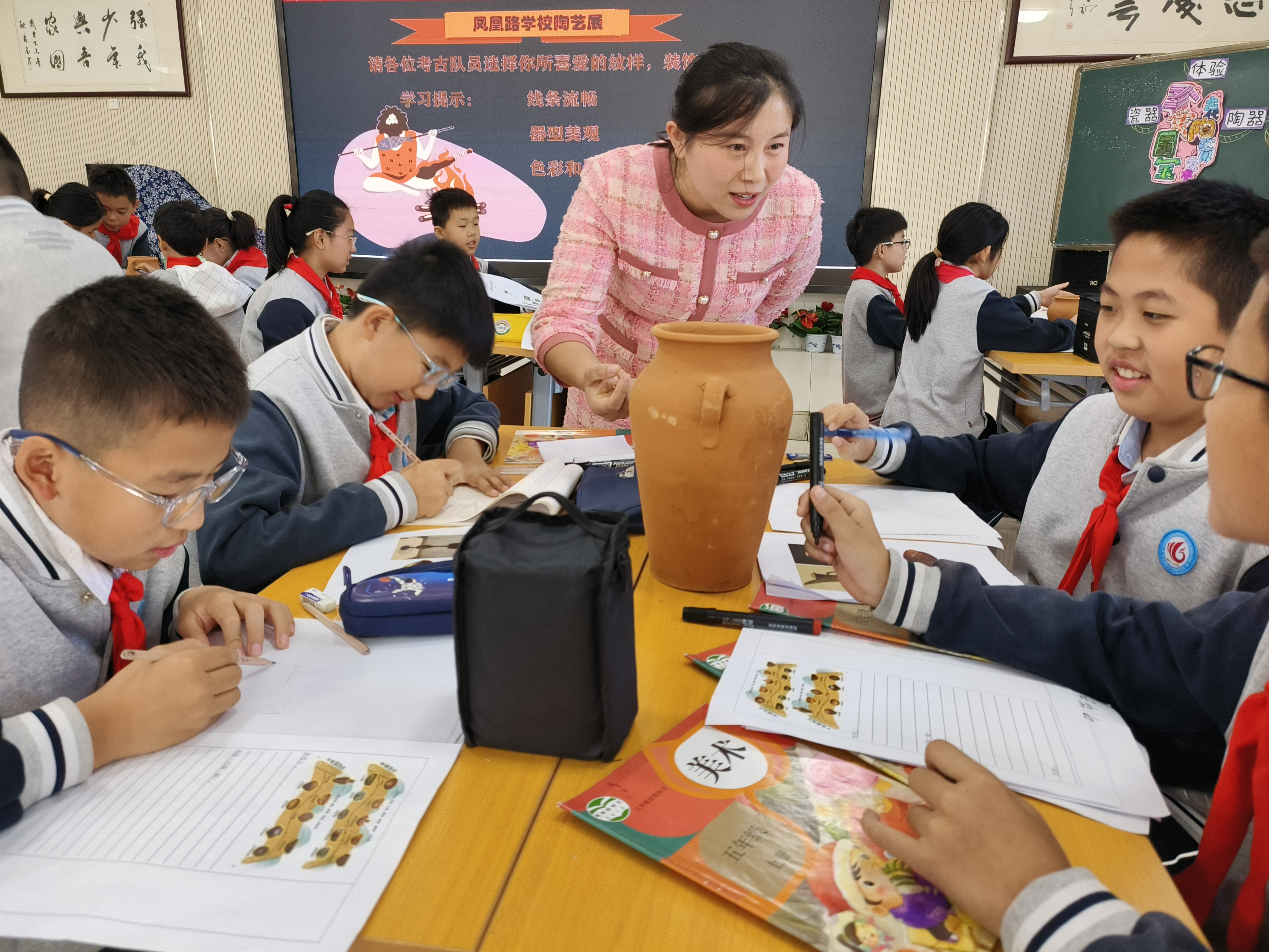 山师美术学院2022级学科教学(美术)专业研究生公瑞敏、刘淑艳及高新区康虹路小学美术教师杨策就人教版五年级第九册第20课《珍爱国宝——古代陶瓷艺术》进行了展示交流。