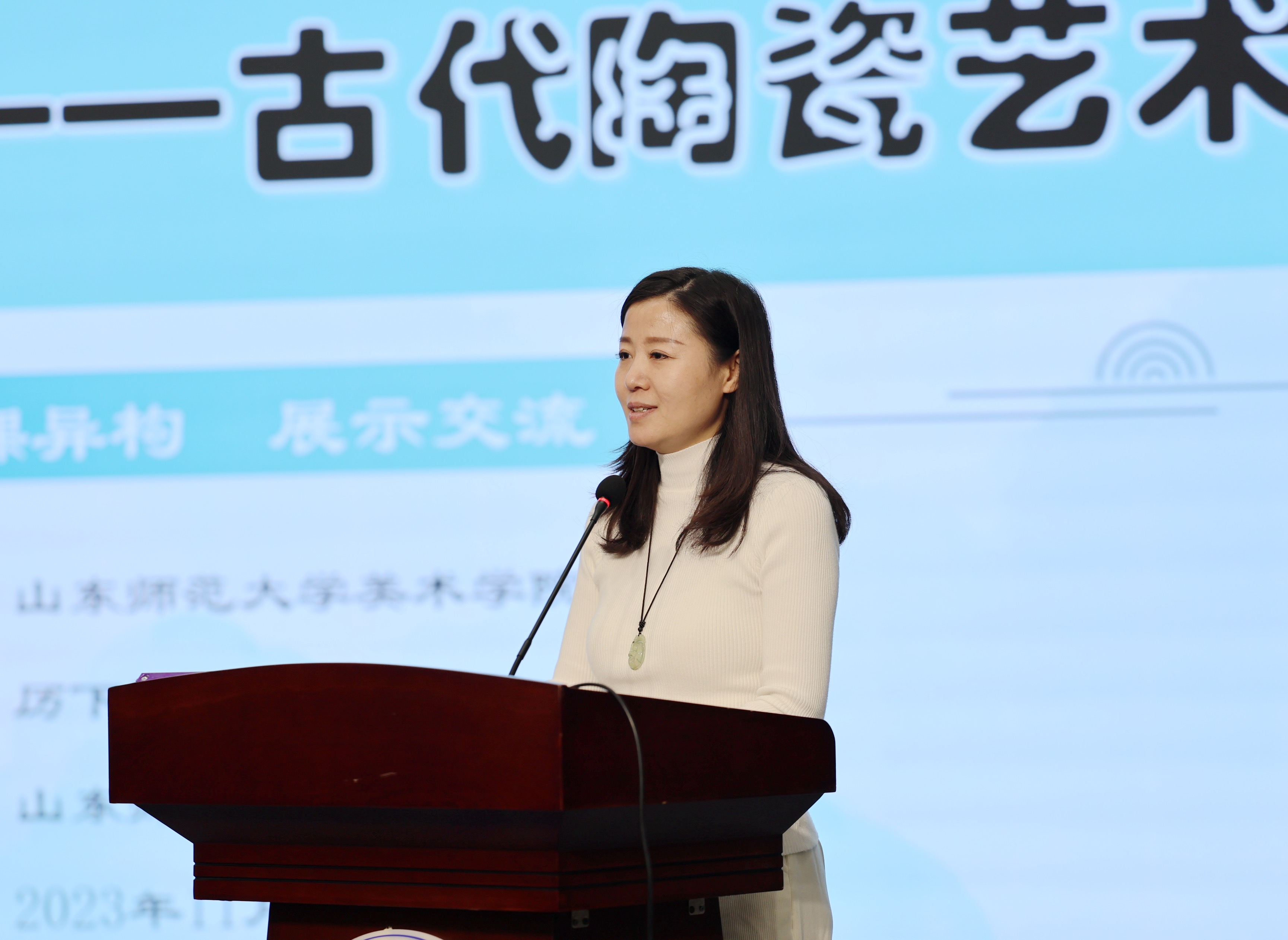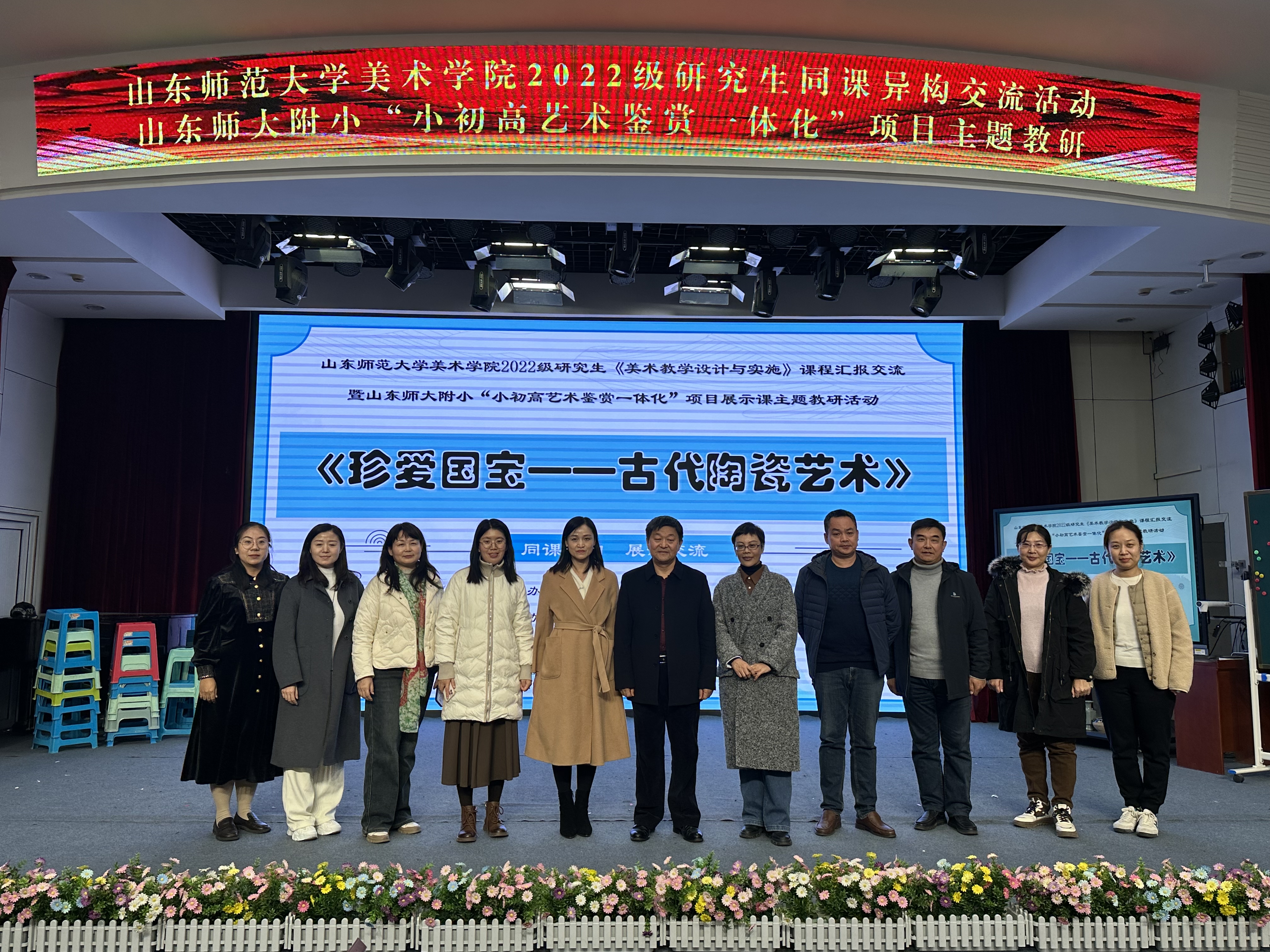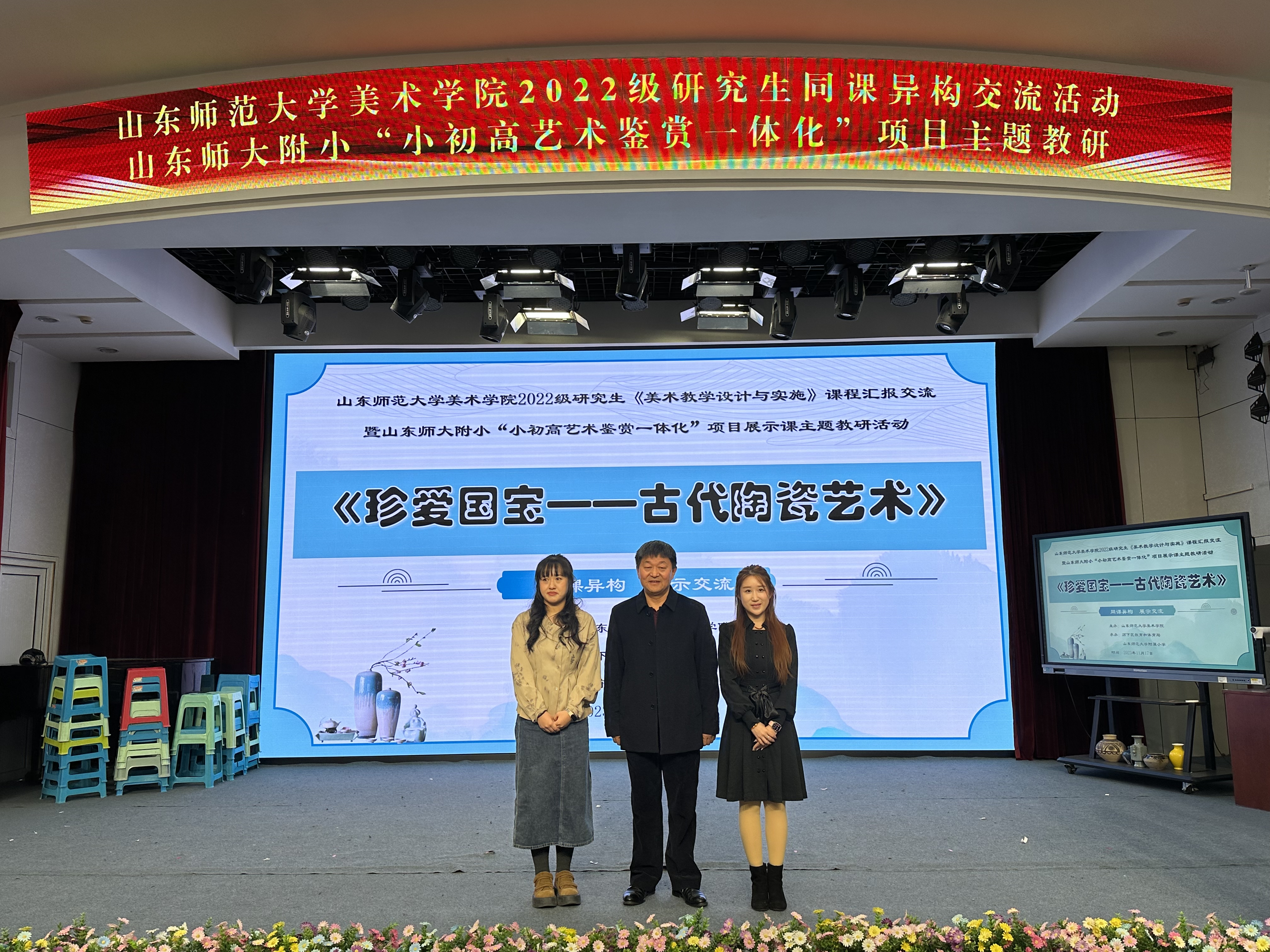 山东省教育科学研究院美术教研员肖钢、高等教育研究中心主任刘燕飞、赵燕鹏,山东师范大学美术学院美术教育系主任刘宁、教育系教研室主任丁翠红、李楠,济南市教研员张焕玉,槐荫区教研员郭立、天桥区教研员孟庆娟、高新区教研员王莹、南部山区教研员王莎,山师附小副校长曲淑华、教务处副主任曲铭、经成小学美术教师魏晓宇、龙鼎实验学校美术教师李冉、亓鑫出席,以及济南市历下区美术教师及2022级、2023级学科教学(美术)全体研究生参加了本次活动。山师美术学院2022级学科教学(美术)专业研究生虞欣南、李湘玉及山东师大附小美术教师徐凯妮就人教版五年级第九册第20课《珍爱国宝——古代陶瓷艺术》进行了展示交流。