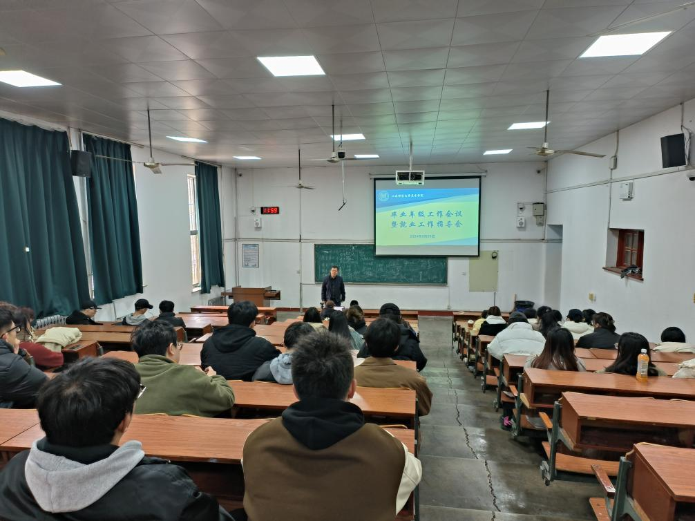 会上,毕业年级辅导员丁彬从“时间节点”、“重点工作”、“促升学推就业”等三个方面阐述了本学期的任务与要求,助力每位学子顺利毕业,以“松柏之质,经霜弥茂”的气度去面对升学和择业。他强调,提升就业能力应看清整体形势,摆正心态,早准备、早选择、早行动,针对个人实际补短板,以积极乐观的心态面对每一个就业机会。同时,鼓励研究生复试的同学放平心态,综合考虑,从而做出最合适的抉择。