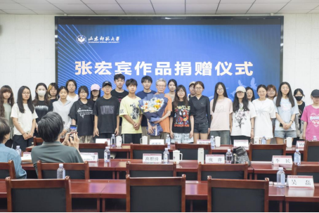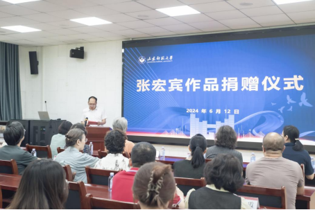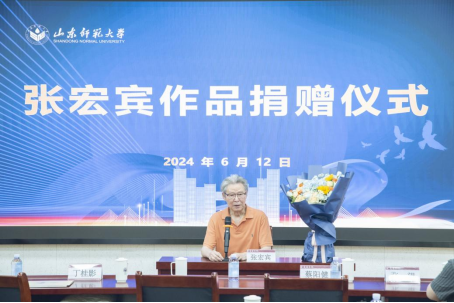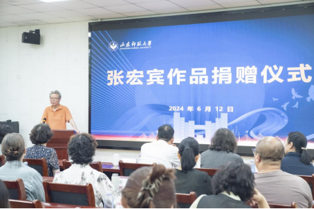 6月12日上午,张宏宾作品捐赠仪式在山东师范大学千佛山校区2126教室举行,山东师范大学党委常委、副校长蔡阳健,山东师范大学合作发展处副处长李敏,山东师范大学美术学院党委书记胡晓明、院长刘明波、党委副书记葛晓霞、副院长吴磊、副院长李民,山东省美术家协会名誉主席、山东师范大学美术学院博士研究生导师张望,博士研究生导师宋丰光以及美术学院师生代表、退休教师代表和校外知名专家代表参加捐赠仪式。捐赠仪式由院长刘明波主持。