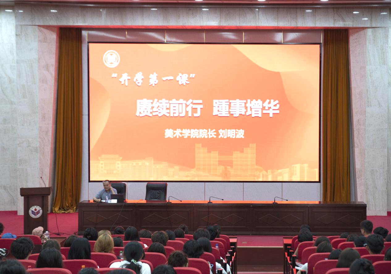新生见面会后,刘明波院长为同学们讲授了一堂生动而深刻的“开学第一课”。他首先以“赓续前行 踵事增华”为主题,详细介绍了学院学科专业设置情况,为同学们提供了各方向有益发展的参考建议。随后,他以《感物——唯有少年心》为主题,介绍了当代美术创作的整体概况,并围绕当代绘画生态、创作呈现形式、创作经验形成等方面进行了讲解,分享了个人创作的经验和心得。他将国际形势、全球变暖、论文写作等话题融入讲座之中,激发了创作灵感,通过切身体会阐明了只有不断尝试、不断挑战,才能在艺术创作的道路上走得更远。他鼓励现场同学要不断提升专业素养和综合能力,走好艺术之路的每一步,为今后创作出更多精品佳作,更好从事艺术教育工作打下坚实的基础。