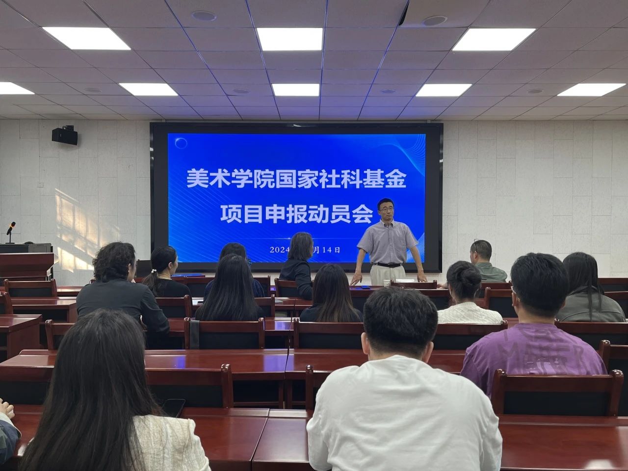高景海处长回顾了近年来我院人文社科研究工作取得的成绩,以及学校科研评价指标政策在美术学科方面的变化。指出学校针对不同学科领域因时因地制宜,调整政策支持力度,鼓励美术学院发挥自身特长优势,在本领域高水平学科项目申报中再创佳绩。高处长在讲话中指出,科研处已经划拨专项经费到美术学院,鼓励学院发挥主观能动性,切实加强基金申报工作组织力度,为科研工作提供有力支撑和保障。