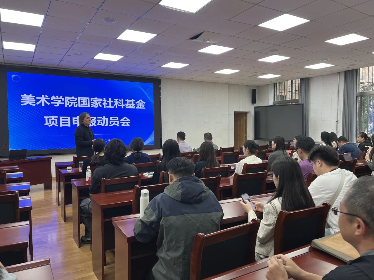 首先,刘明波院长代表美术学院对高景海处长,以及今天到会的人员表示感谢。对我院2025年国家社科基金项目的申报工作提出了殷切希望,指出国家社科基金的申报与立项是衡量个人科研水平和学院核心竞争力的重要指标。学院教师要不怕困难和挫折,迎难而上,知难而进,做到应报尽报,确保基数同时,提高申报质量和效率。学院将无条件支持教师个人发展,统筹安排学院工作,为申报提供便利条件。