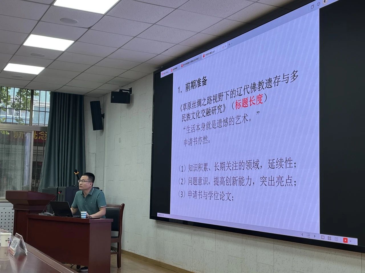 最后,我院国家社科基金的获得者于博副教授,为大家讲解了国家社科基金申报的具体工作流程及申报书的填写,将自己成功申报的经验与总结无私地跟与会者进行了分享和交流。与会人员围绕如何成功申报这一主题进行了深入交流探讨。