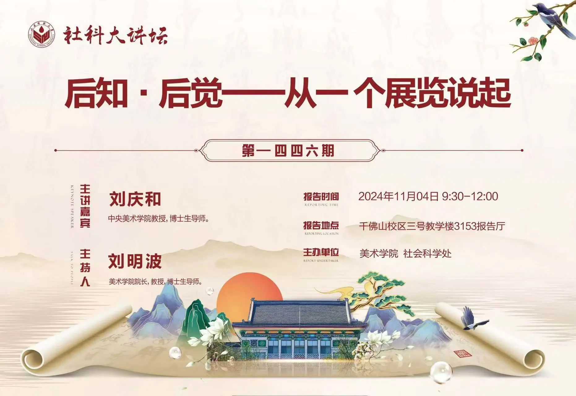 11月4日上午,山东师范大学美术学院于千佛山校区三号教学楼3153报告厅成功举办第1446期社科大讲坛——《后知·后觉——从一个展览说起》。本次讲座作为美术学院美育实践部主办的名家工作坊的系列活动,邀请了中央美术学院教授、博士生导师刘庆和作为主讲嘉宾,山东省美术家协会名誉主席张望担任特邀嘉宾,山东师范大学美术学院院长刘明波担任主持。山东师范大学美术学院的教师、全体博士、硕士及部分本科生参加了本次讲座。