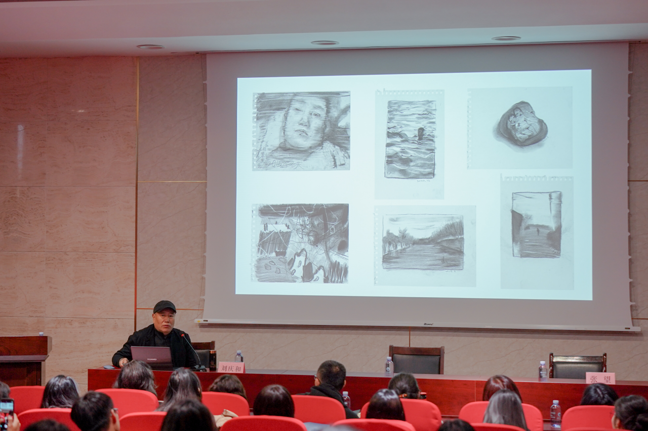 随后,刘庆和先生进行了精彩的分享。讲座以“巨作和画谱”作为开篇,讲述刘庆和先生最为代表的多声部、多时空叙事的来源。刘庆和先生陆续向师生们展示了《临池》《有人》《响水》《青春在海河畔》《向阳花》《白话》 等系列个人展览中的作品,其他代表作品、写生作品、手稿以及现场布展照片等百余幅,并对这些作品背后的灵感来源、象征性表达等进行了深入浅出的阐述。刘庆和先生认为:从传统水墨画中,很难找到都市题材可依循的表现技法,只有依靠自身的生活积淀、对生活真情实意的体验,在创作中进入一种激情的状态,才能更好的发挥自我。作品中视角的改变同样带来了感知的变迁。这些由时间和记忆达成的作品,既是绘画的魅力,亦是一段段档案,它追溯着个人的记忆,已确认自身的来处,却无意间牵引出遥远的发生,成为时代变迁的佐证、中国近百年巨变中细腻而又温情的缩影。
