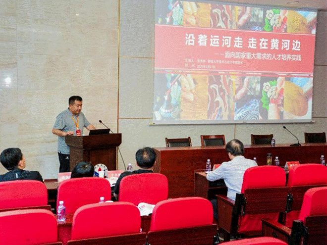 聊城大学美术与设计学院院长张兆林教授,为大家分享了《沿着运河走 走在黄河边——面向国家重大需求的人才培养实践》,聊城依托本地独特的地域优势,立足于运河与黄河交汇的特殊地理位置,开展了系统充分的田野调查。在此基础上大力发掘本土优秀文化资源,并成功建设了四个省级非物质文化遗产传承与实践平台,借助平台积极推动艺人与学者之间的学术交流,为传统文化的保护与传承提供了坚实基础。科研团队组建方面,青年教师队伍秉持科研“六要素”,提出“以贡献求发展,以作为求生存”的建设理念,通过明确教学重点、优化人才培养模式以及加强教师团队建设,促进科研与教学的深度融合与互动。一系列举措为创新人才培养模式提供了新思路新方法,也为地方文化与教育的协同发展探索出了具有示范意义的路径。