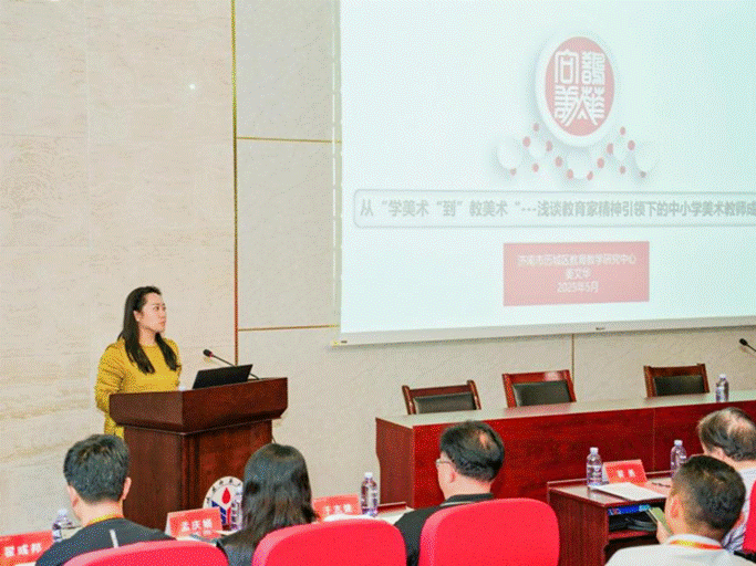 济南市历城区教研中心师训部主任、美术教研员姜文华,以《从“学美术”到“教美术”--教育家精神引领下的中小学美术教师成长》为主题展开分享。她首先以自身的教师成长经历为切入点,讲述自己从“学美术”到“教美术”的转变过程,借此引出本次主题。随后,姜老师展示了济南市历城区“鹊华向美”美育品牌体系架构,提出“鹊华向美,美美与共”的美育理念,强调其不仅是一种教育方式,更是一种生活态度。最后,她呼吁与会同仁牢记师德师风是评价教师队伍素质的第一标准,唯有坚守这一准则,才能培养出具有教育家精神的好老师。