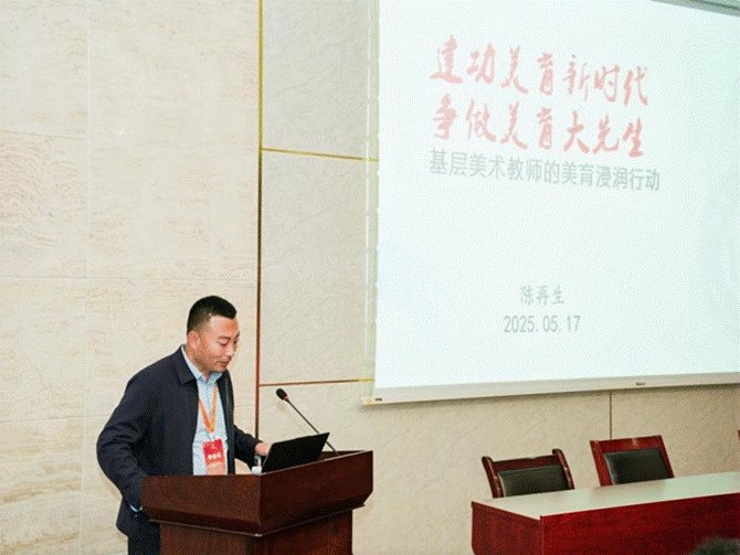 东营市河口区第一中学校长助理、政教处主任陈再生,立足基层美术教师的“美育浸润”行动,深入探讨了美术课在学生全面发展中的重要性。他强调:“美术课不能让步。只有我们美术老师坚定信念,坚持不让步,才能让其他学科教师以及学生改变固有观点,从而真正意识到美术课的重要性。”此外,陈老师提出了“天地人相宜,知行思合一”“养大爱之心,弘大美之艺”“争做美育大先生”等观点,期望与在座的美育同仁共勉,共同推动美育事业的发展。陈老师对美术教育的热爱与情怀深深打动了与会嘉宾,引发了大家的强烈共鸣。