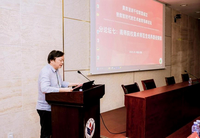 翟勇教授对本次论坛进行了总结,他高度肯定了与会专家围绕“高师院校美术师范生培养路径”所提出的创新理念与实践经验,并强调美育浸润千校联盟的成立不仅是校际合作的重要里程碑,更是新时代美育发展的共同宣言。联盟将致力于整合国内美育资源,推动师资培养模式的创新,通过数字化平台共享课程、案例与研究成果,打造一个开放、协同的“大美育”生态圈。翟勇教授代表主办方向所有参会嘉宾、师生及工作人员致以诚挚的谢意,并呼吁各界同仁以联盟为纽带,携手探索数智时代美育发展的中国路径,让美育真正浸润校园、滋养生命,为培养德智体美劳全面发展的社会主义建设者和接班人贡献力量。