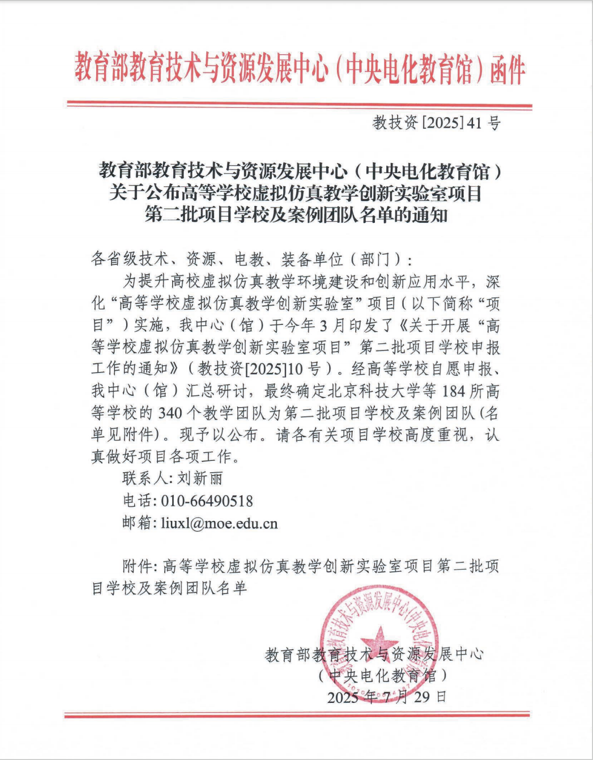 近日,教育部教育技术与资源发展中心(中央电化教育馆)正式发布《高等学校虚拟仿真教学创新实验室项目第二批项目学校及案例团队名单》(教技资〔2025〕41号),我院孙夕恺副院长带领团队申报的“师范生美育素养提升虚拟仿真教学实验室”项目成功入选,团队其他成员有李荣智、丁翠红、李晓娣、曹娜。本次共有184所高校340个案例团队入选。