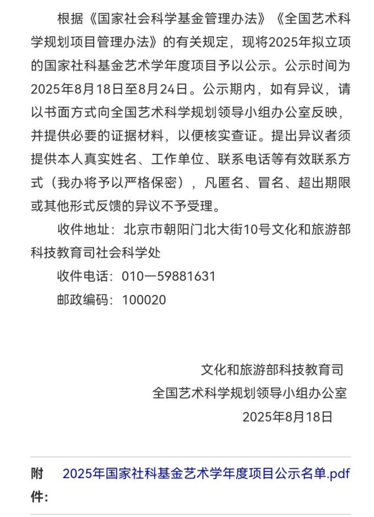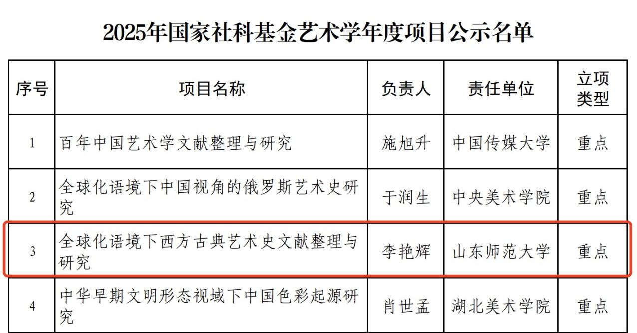 近日,文化和旅游部科技教育司、全国艺术科学规划领导小组办公室下发立项通知,正式公示了2025年国家社科基金艺术学年度项目立项名单。获批项目共285项,其中重点项目26项。我院李艳辉老师申报的《全球化语境下西方古典艺术史文献整理与研究》获批重点项目。该项目系我院历史上首个获批的国家社会科学基金艺术学重点项目,实现了国家社会科学基金重点项目立项零的突破。