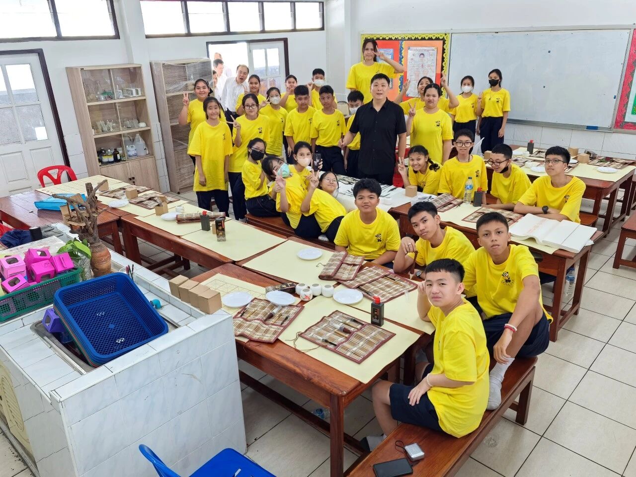 本期文化大乐园由山东师范大学主办,北榄公立培华学校倾力承办,并联合济南大学、山东青年政治学院、泰山学院的12位优秀教师,为北榄公立培华学校和泰国中国国际学校的350余名学生带来一场沉浸式文化体验。教师们匠心独运,开设了书法、国画、民族音乐、舞蹈、武术、剪纸、漆扇、京剧脸谱等极具魅力的课程。我院教师刘翔鹏教授赴泰讲学,负责国画课执笔授课,带领同学们领略水墨丹青的魅力。在课堂上,毛笔,不再只是绘画工具,更成为传递中华传统文化的使者。通过学习构图、用笔、设色等技巧,同学们不仅能感受中国画的意境之美,更能掌握其独特的艺术语言,激发审美感知与艺术创造力,创作出属于自己的艺术作品。