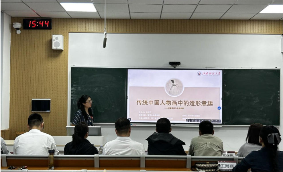 张洋子老师以《传统中国人物画中的造形意趣》为题,展开了深入浅出的讲解。她的课程逻辑清晰,分为“有意味的意象形态”和“意象形态的情趣表达—以形写神”两大部分,通过精炼的板书,系统地阐释了中国人物画超越形似、追求神韵的艺术精髓,以精辟的总结收尾,展现了扎实的理论功底。