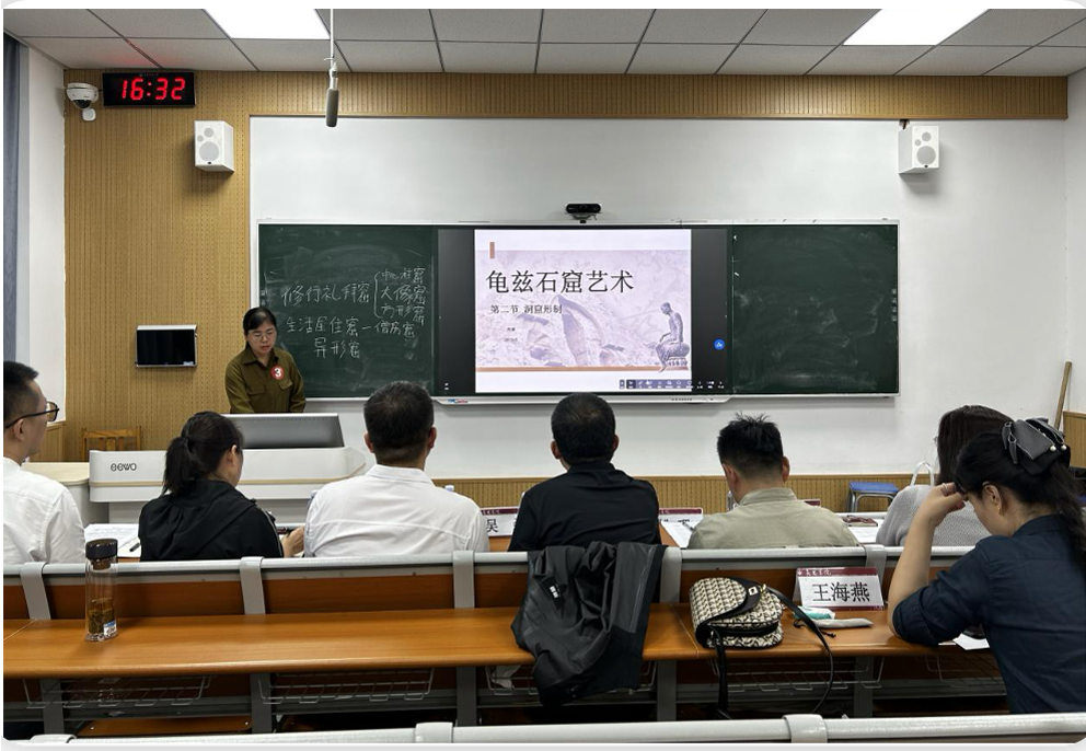 曹娜老师带领大家进行了一场《龟兹石窟艺术》的视觉穿越。她重点讲解了石窟中功能各异的“修行礼拜窟”与“生活居住窟”,并借助PPT展示了大量珍贵的石窟壁画与洞窟实景图片,使遥远而神秘的龟兹艺术变得直观可感,激发起人们的求知欲与文化认同感。